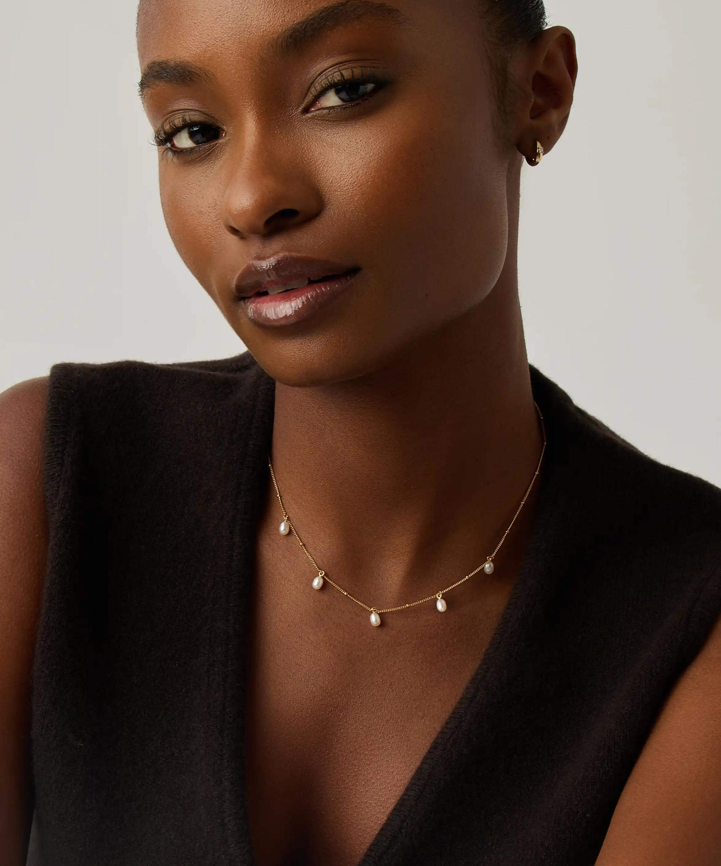 Impeccably crafted from sterling silver plated in 18ct gold vermeil, it’s formed of a fine curb chain accented with golden beads and five baroque pearls evenly stationed along the chain. Exuding iridescent shimmer from every angle, the pearls reflect the light with a soft lustre – perfectly balancing innovation and tradition. Style yours as a solo piece or team it with gold chains and pendant necklaces to build a dynamic necklace curation bound to leave a lasting impression.