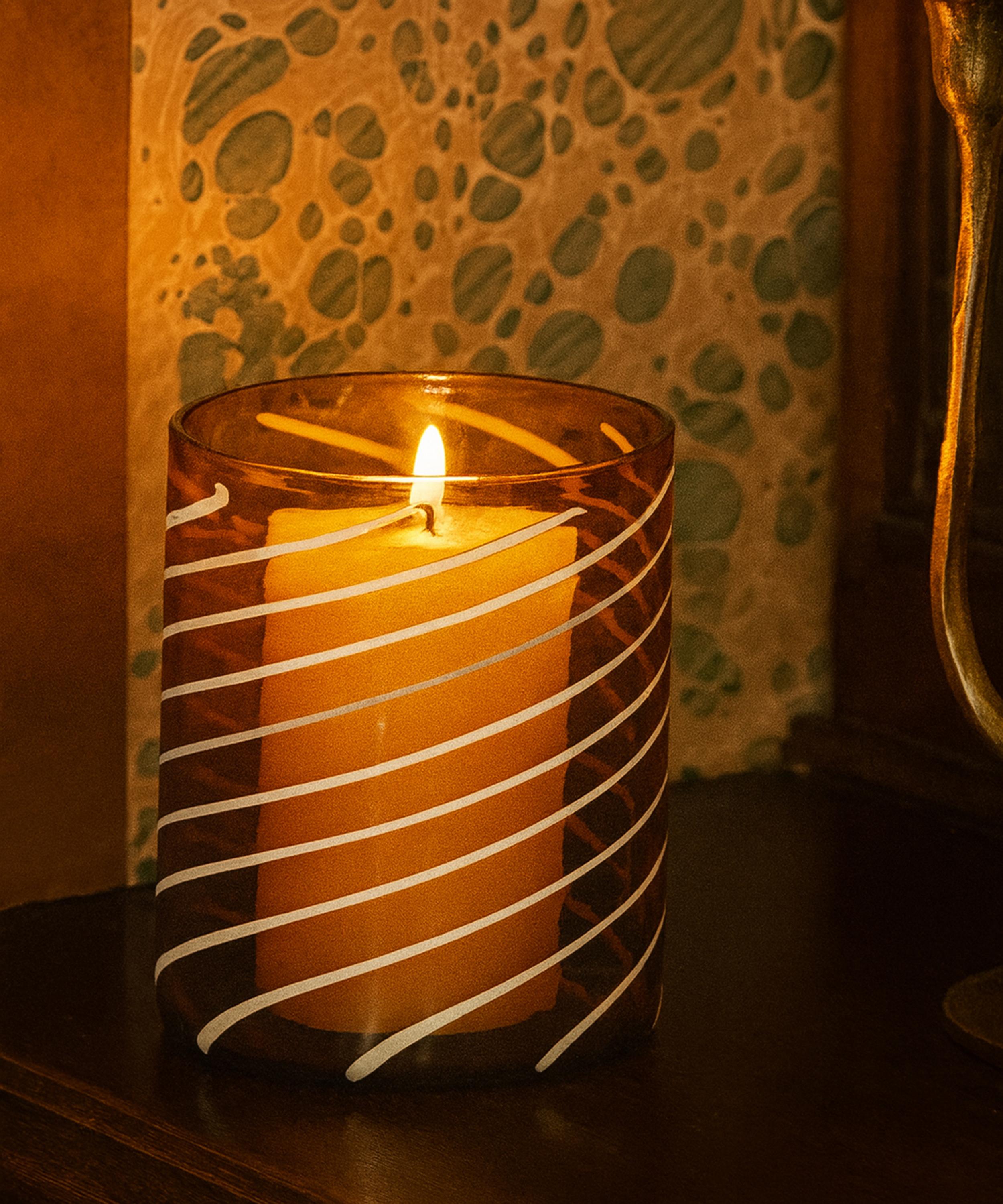 A homeware brand that celebrates the eclectic landscape of a lived-in home, this large glass tealight holder is distinctively characterised by its heat-encrusted, swirling white lines, brought to life with much precision and patience. The fine glass gently filters the flame, diffusing a warm, amber-lit glow – perfect for conjuring a blissful atmosphere in your living room, bedroom or bathroom.