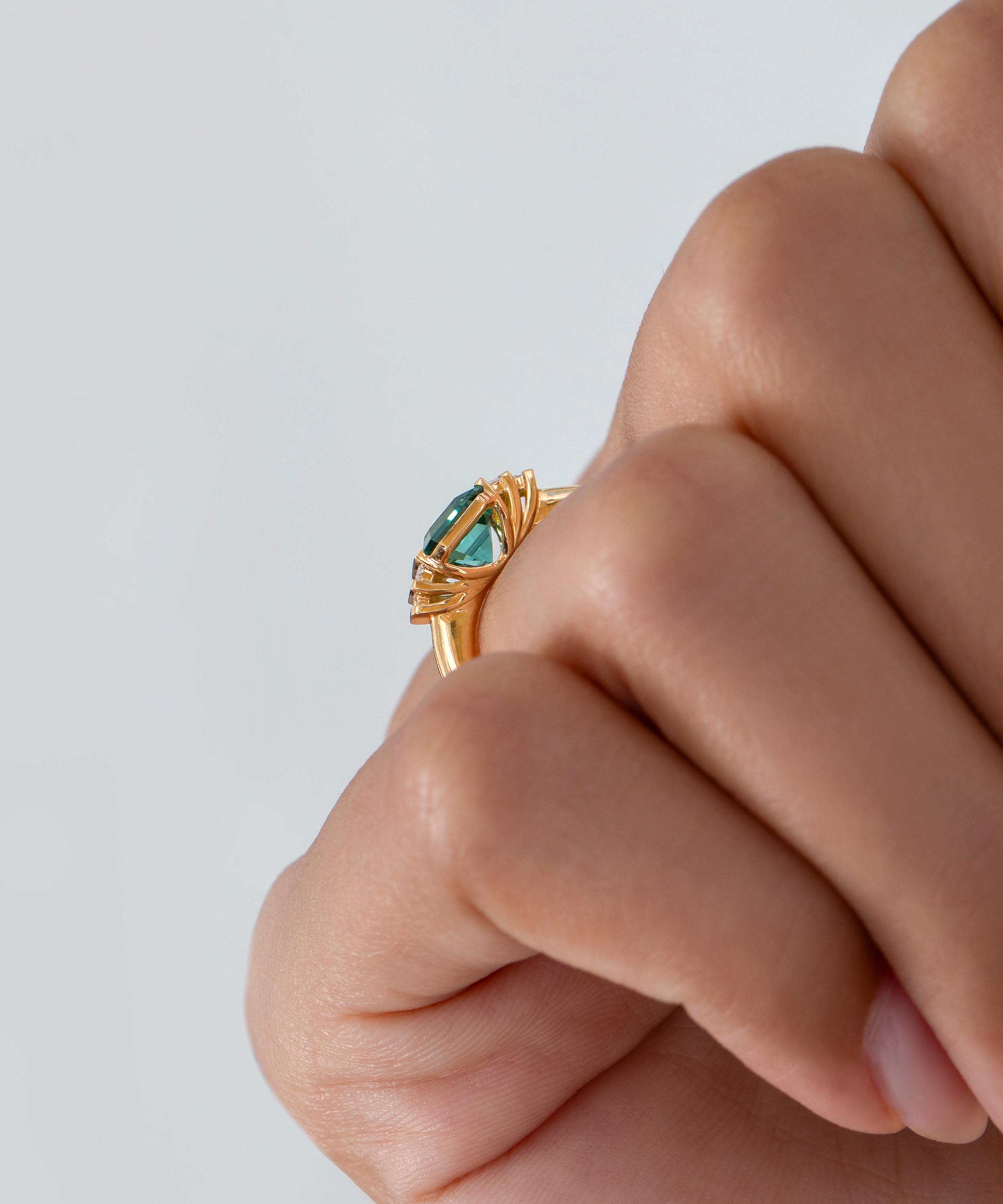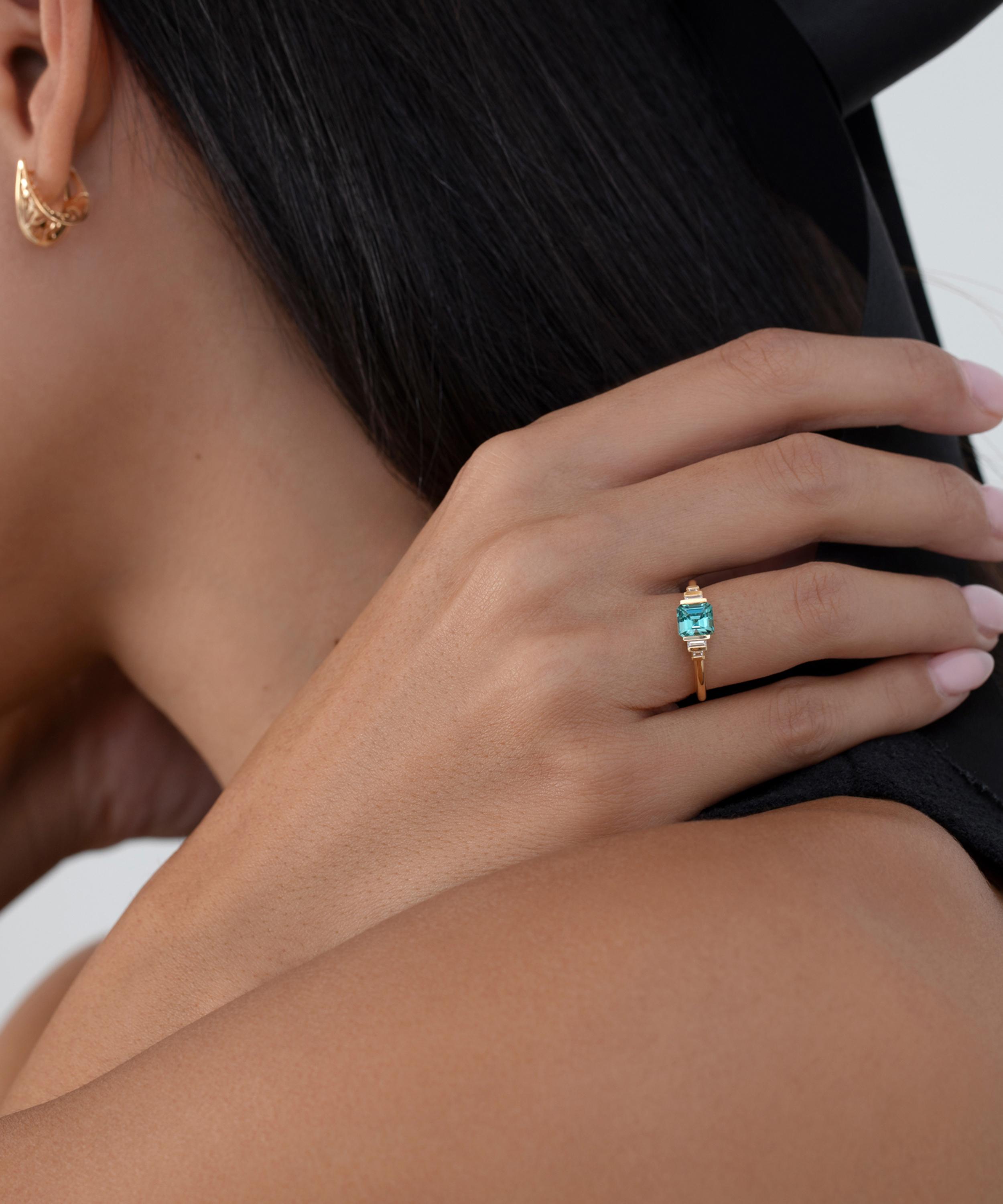 The Atlantis Asscher Cut Tourmaline Engagement Ring from fine jewellery brand Artemer exemplifies the designer’s expert eye for divine compositions. A symbol of love and dedication, this ring is crafted from solid 18ct gold, featuring a one-of-a-kind, asscher-cut tourmaline centre stone, flanked by baguette cut diamonds on either side. Style it solo, stack it with a wedding band or team it with other gem encrusted rings for a beautiful curation that’s out of this world.