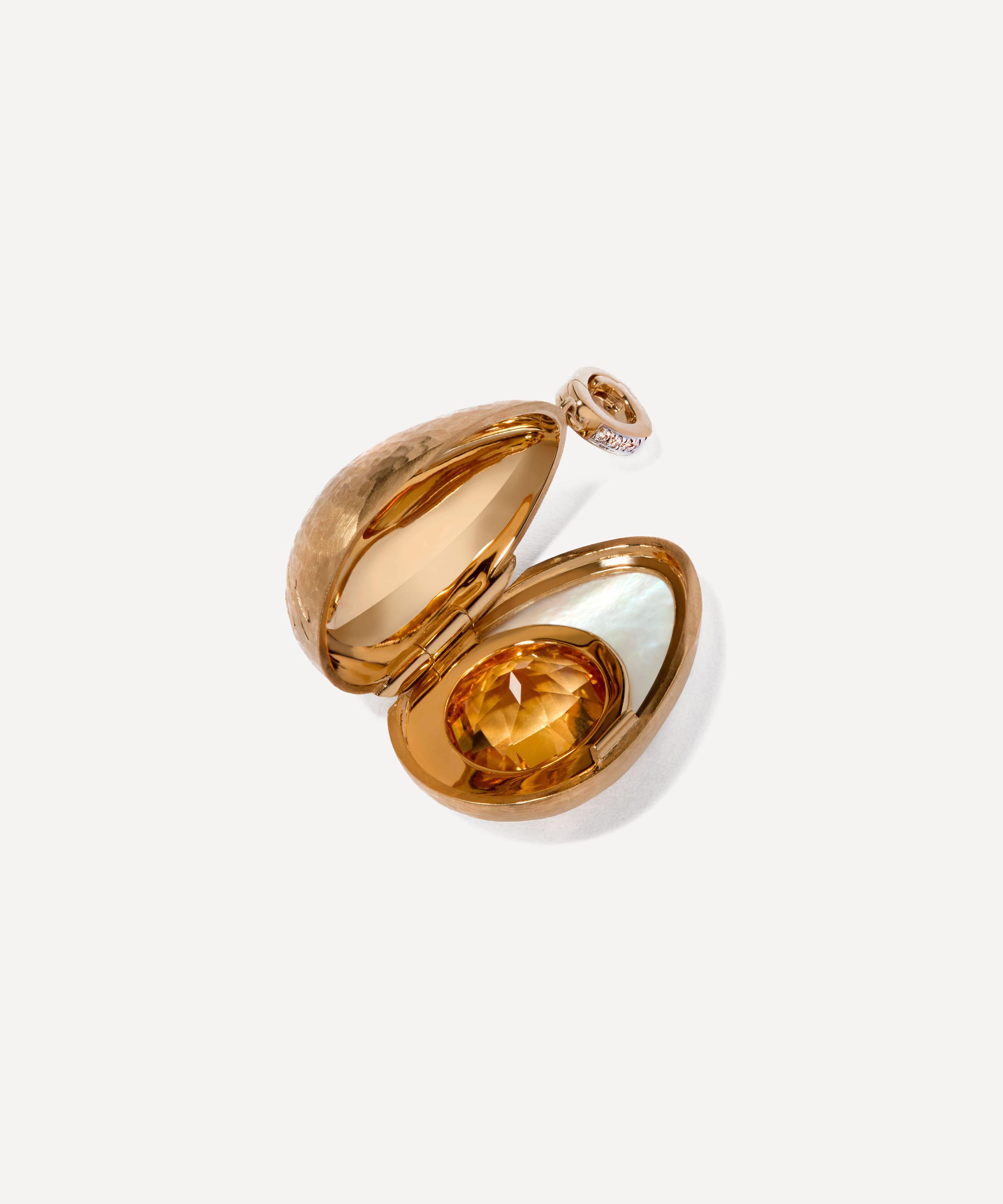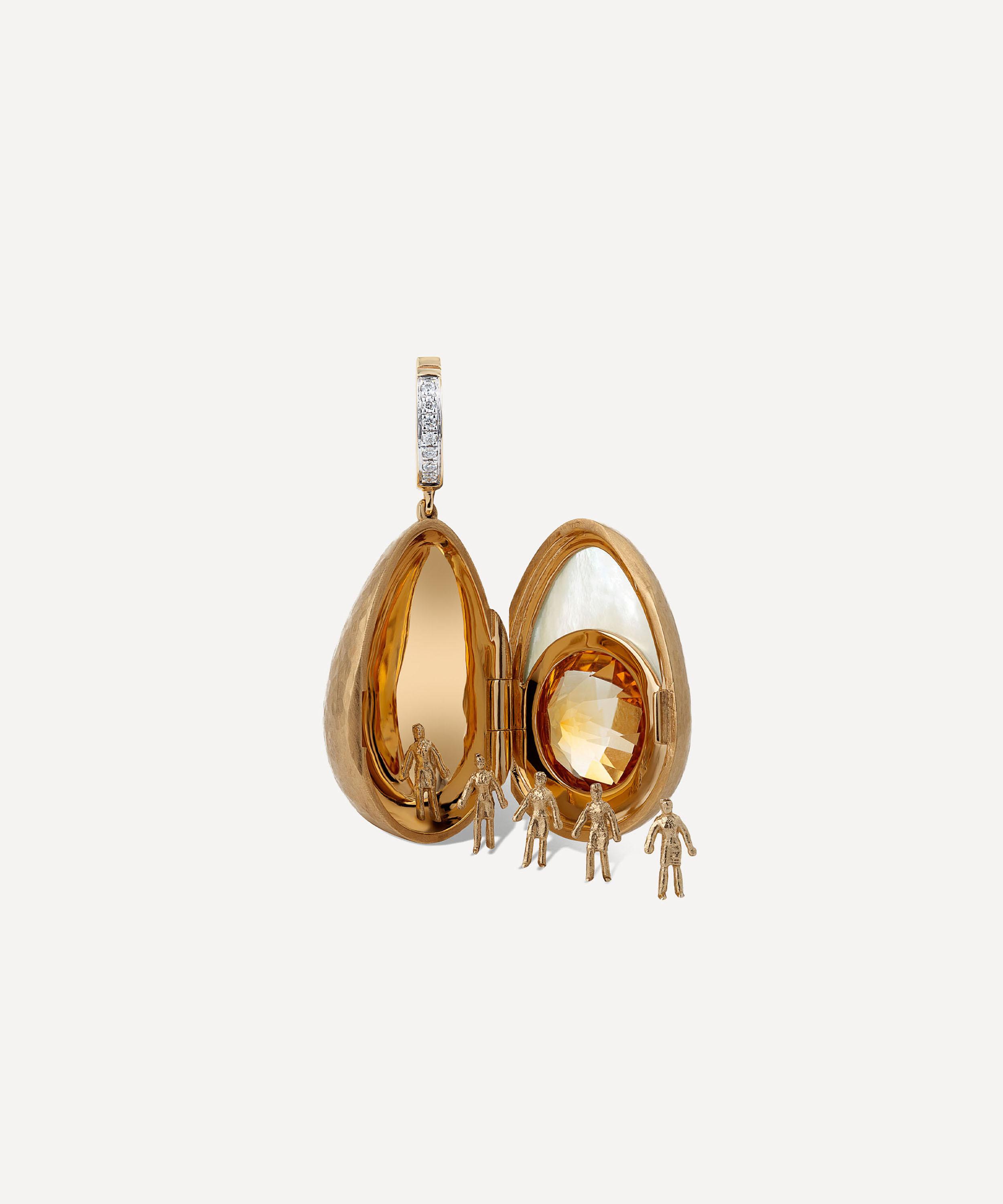 Capturing the timeless, enduring significance of a locket in a modern way, it takes the shape of an egg, a representation of new beginnings. Featuring mother of pearl as the white of the egg, it’s adorned with a central Citrine stone representing the yolk, both encased in a hand-hammered 18ct gold shell. The charm opens to reveal a miniature 18ct gold solider, hidden inside. Let it serve as a tangible reminder of cherished moments, or turn it into a thoughtful and unique gift for a loved one.