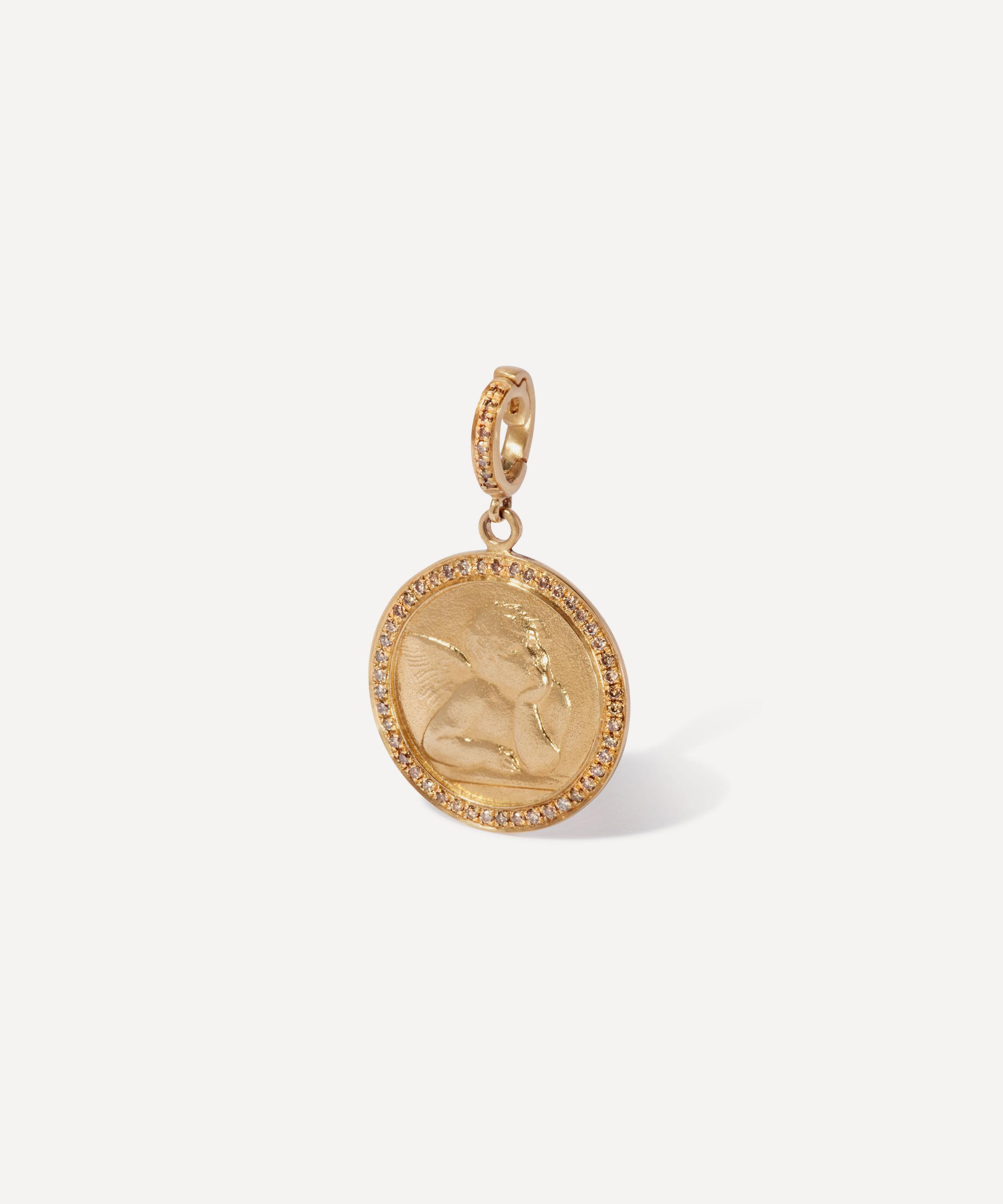 This petite medallion charm is crafted from 18 carat gold with a raised textural cherub design and a high-polished satin finish. The rounded edge and bail clasp are hand set with 54 dazzling brown diamonds totalling 0.21 carats for a welcome touch of sparkle. Style it solo on a fine trace chain or team it with an array of other polished pendants, chains and gem-encrusted charms for a subtly bohemian finish.