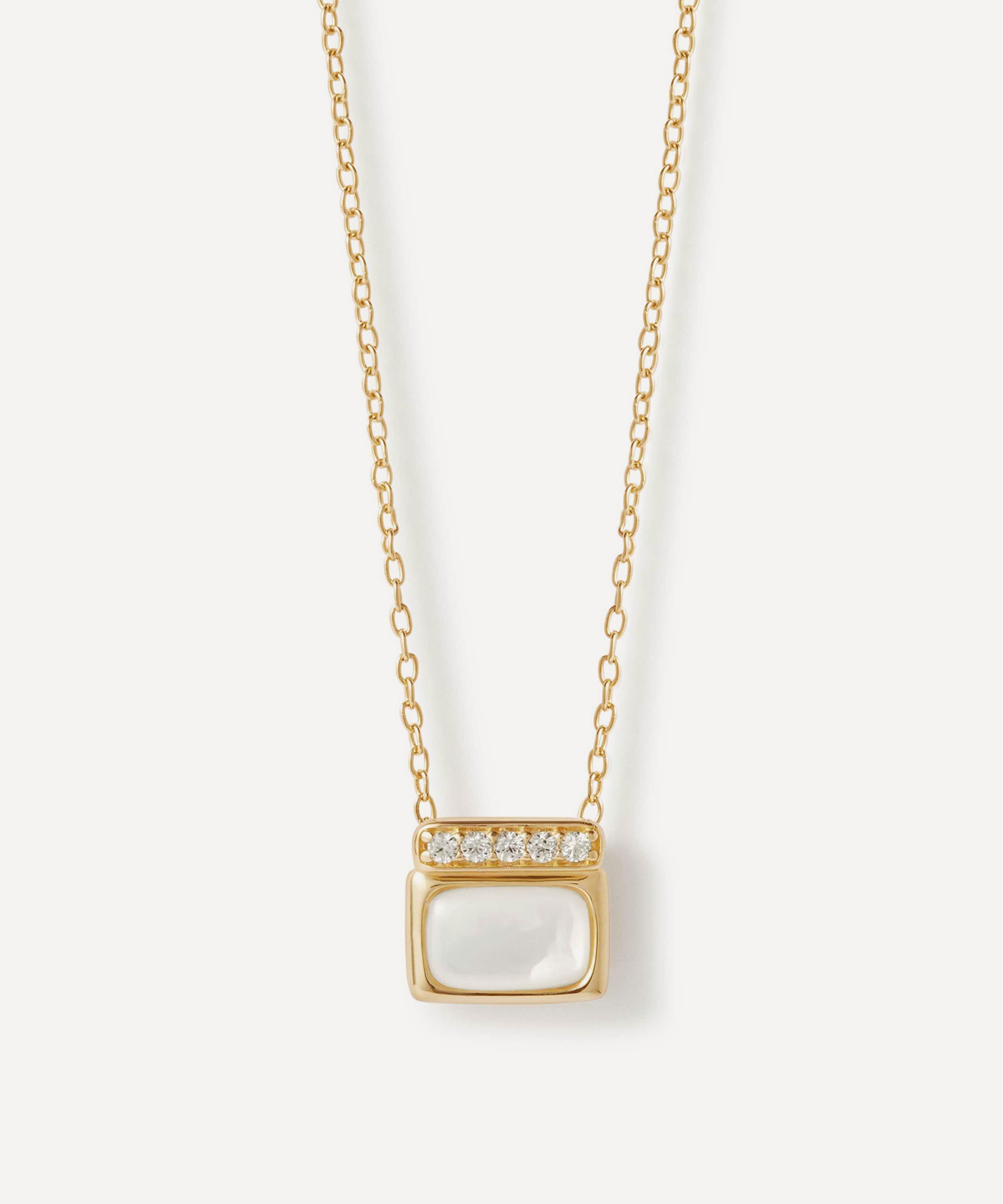 Crafted from sterling silver plated in 18ct gold vermeil, it features a ridged pendant embellished with a central mother of pearl topped with white sapphires. Suspended from a fine trace chain, style it solo, stack with other gold necklaces, or team it with matching pieces from the collection.