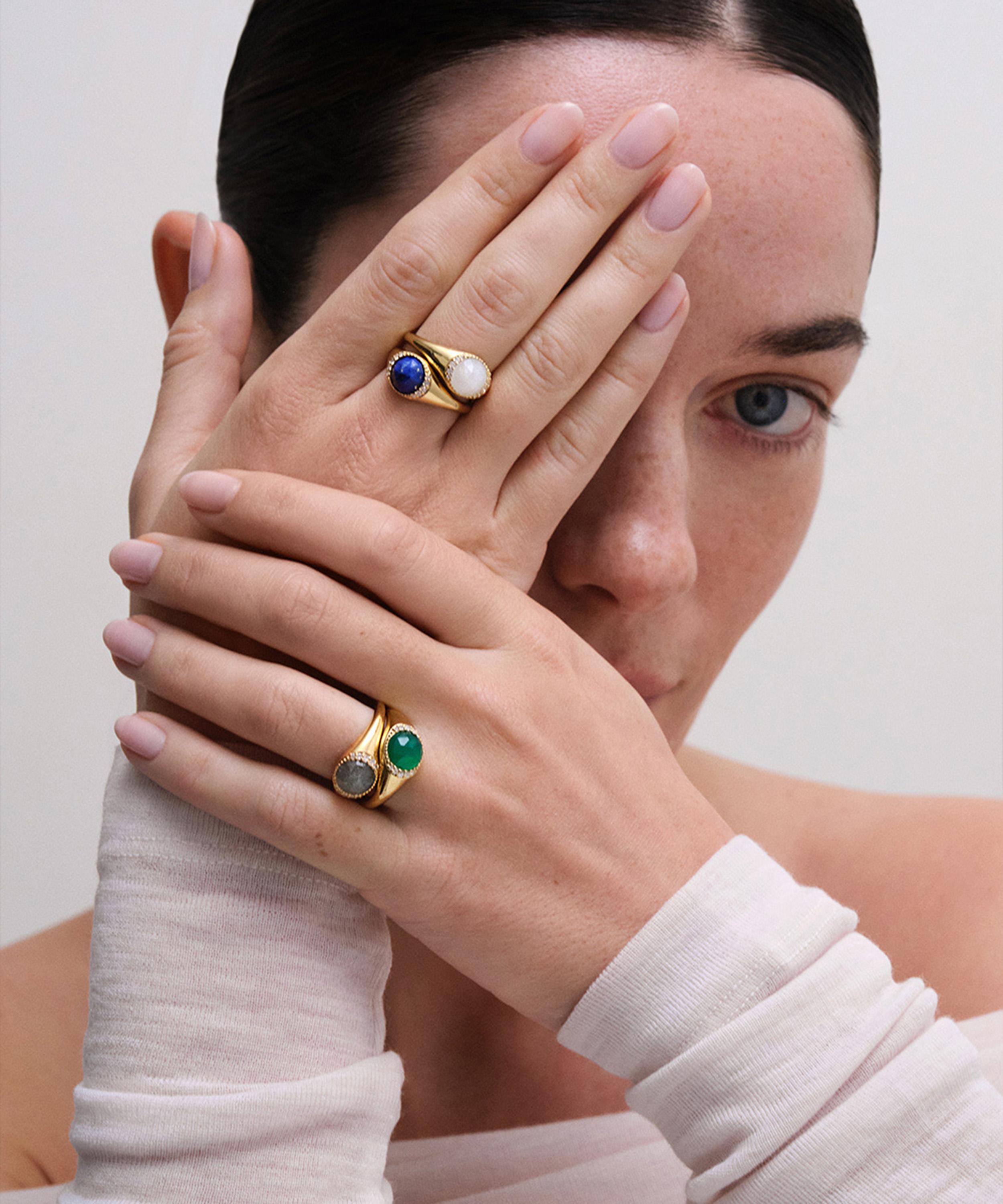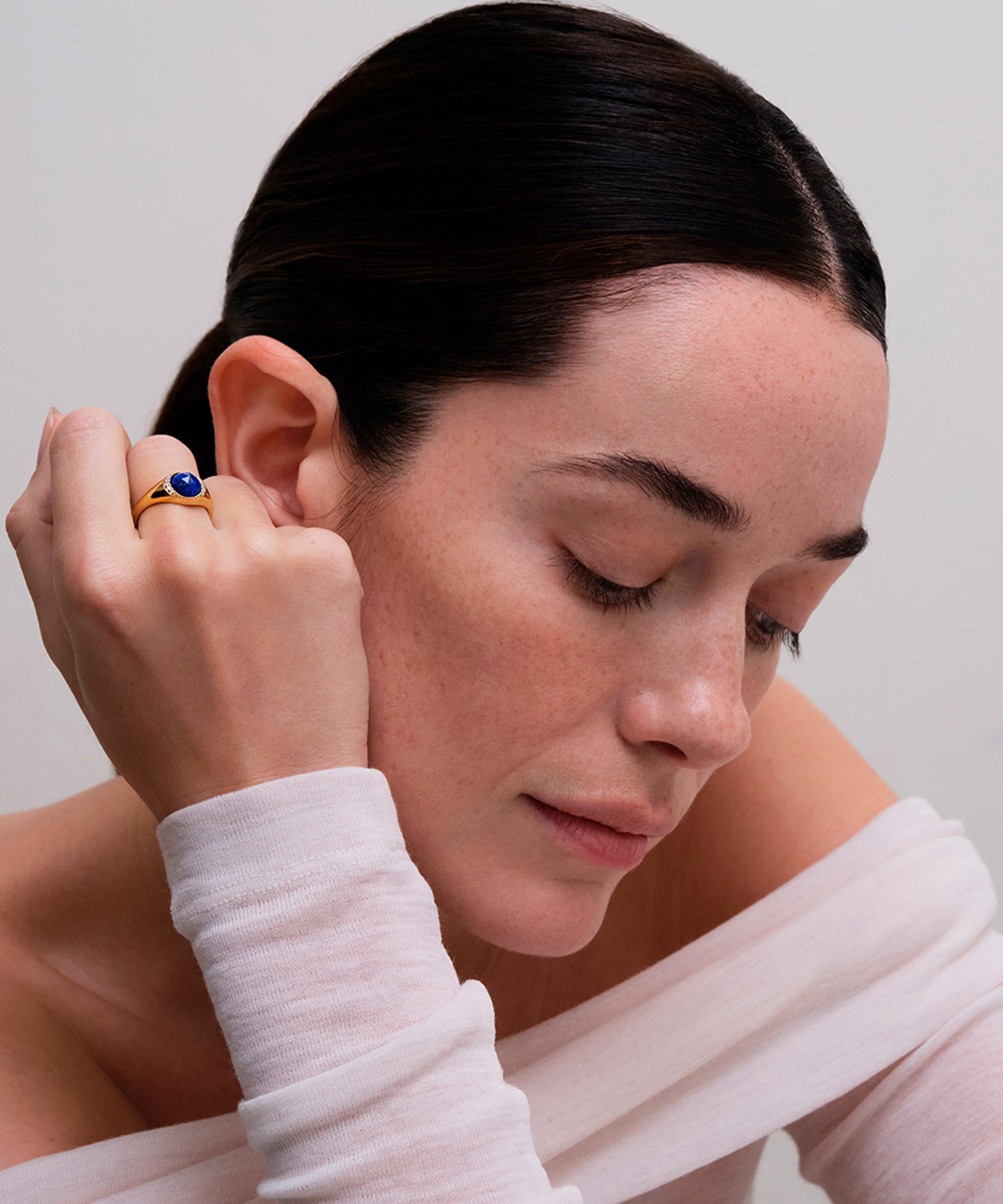 Crafted from sterling silver plated in 18ct gold vermeil, it’s characterised by a faceted lapis lazuli centre stone – a symbol of wisdom - framed by a circle of sparkling white sapphire. Offering endless styling options, wear yours on its own, layer with other cocktail rings, or pair it with the matching necklace and earrings for a coordinated look.