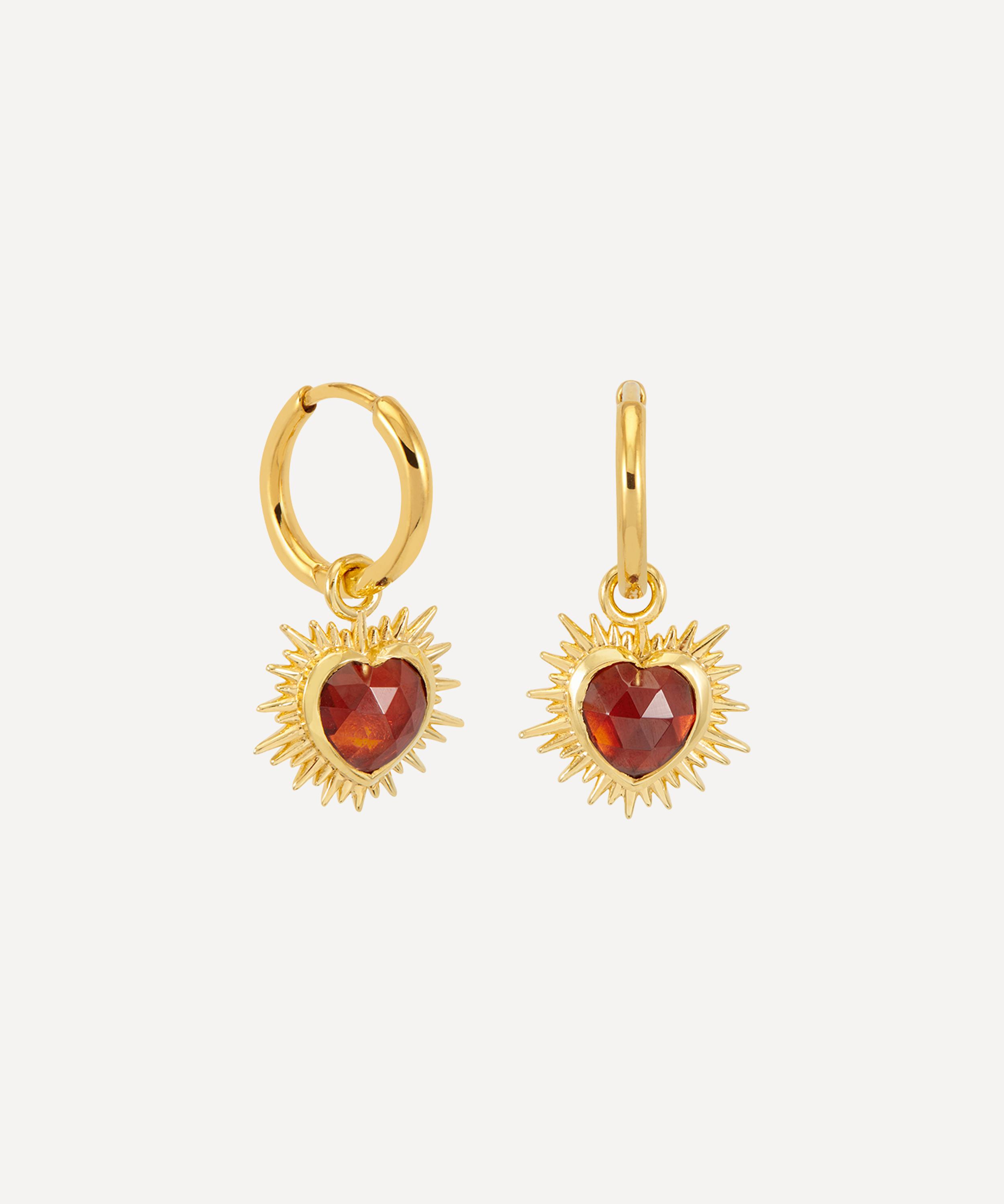 Add a bold edge to your look and exude an empowering aura with these huggie hoop earrings from Rachel Jackson’s Electric Love collection. Crafted from 22ct gold-plated silver, each earring features a polished hoop with an Art Deco-inspired garnet heart drop, adorned with sun burst detailing. Style them solo, stack with other earrings or team them with a matching necklace or bracelet from the collection.
