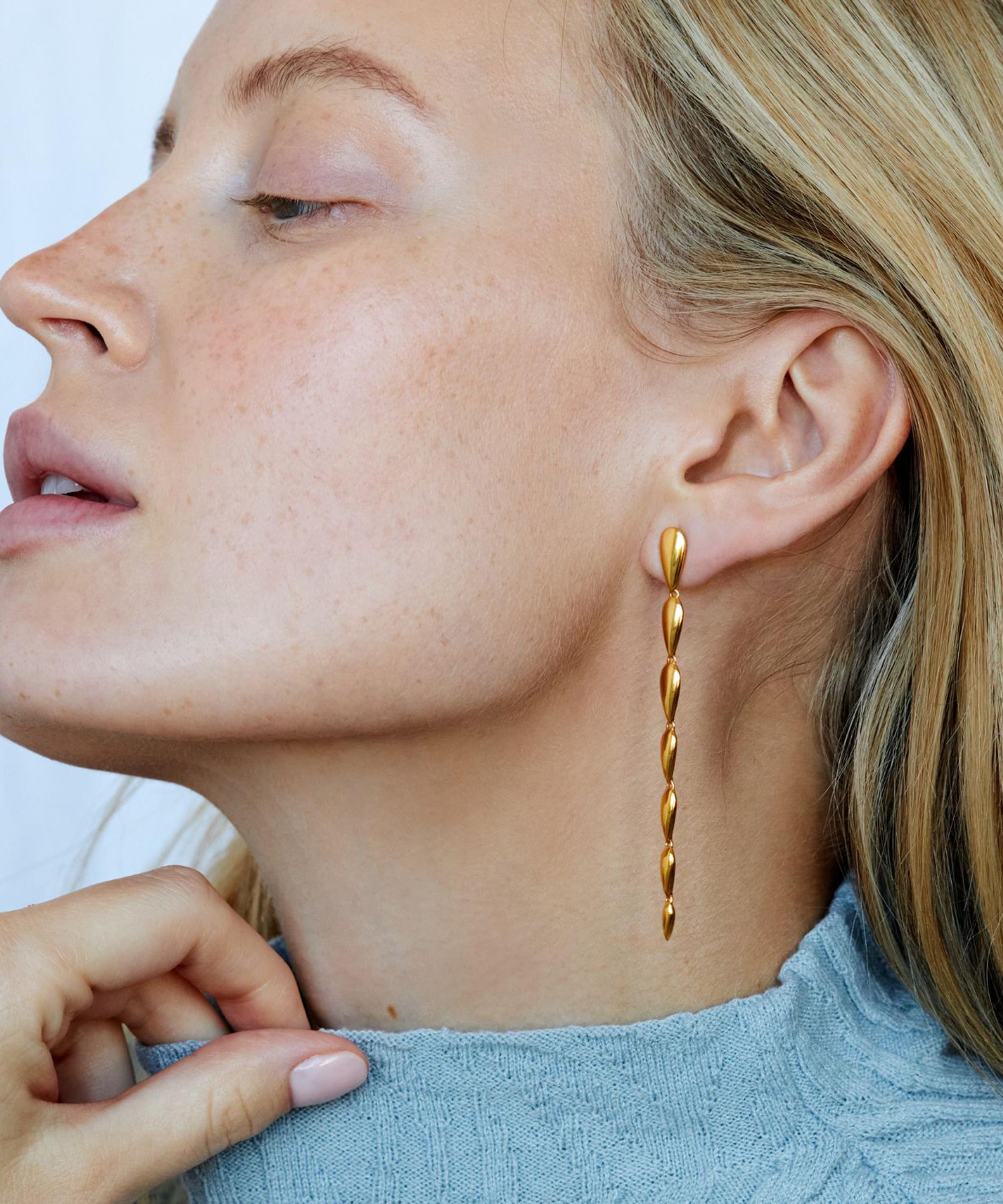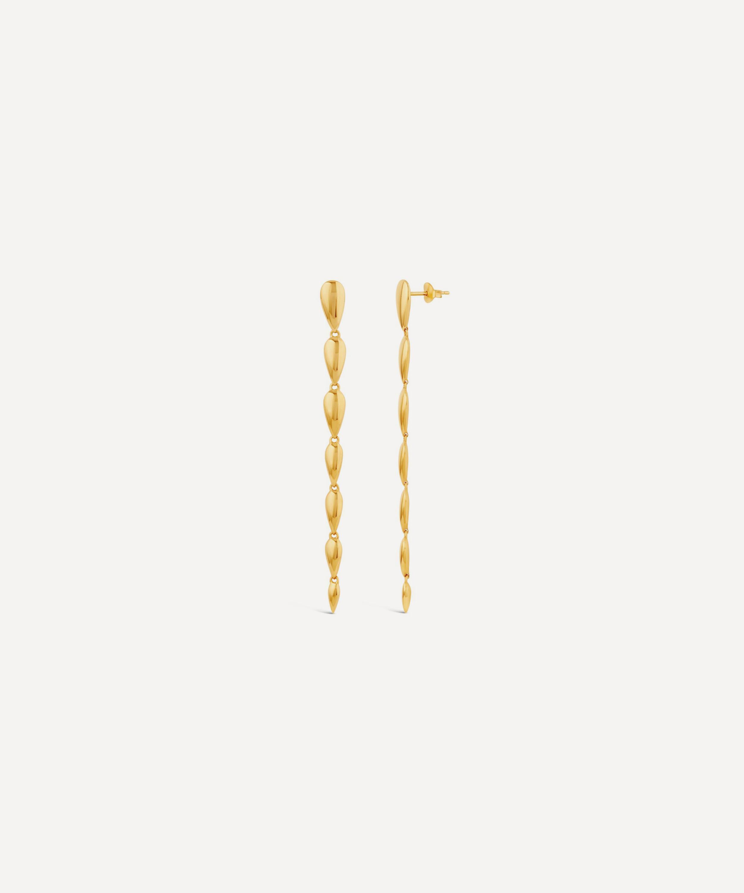 Crafted from 22ct gold-plated silver, each earring is fashioned into a long drop of pointed columns, radiating with light from every angle. Style them solo, or team with the matching pieces from the collection for a coordinated finish.