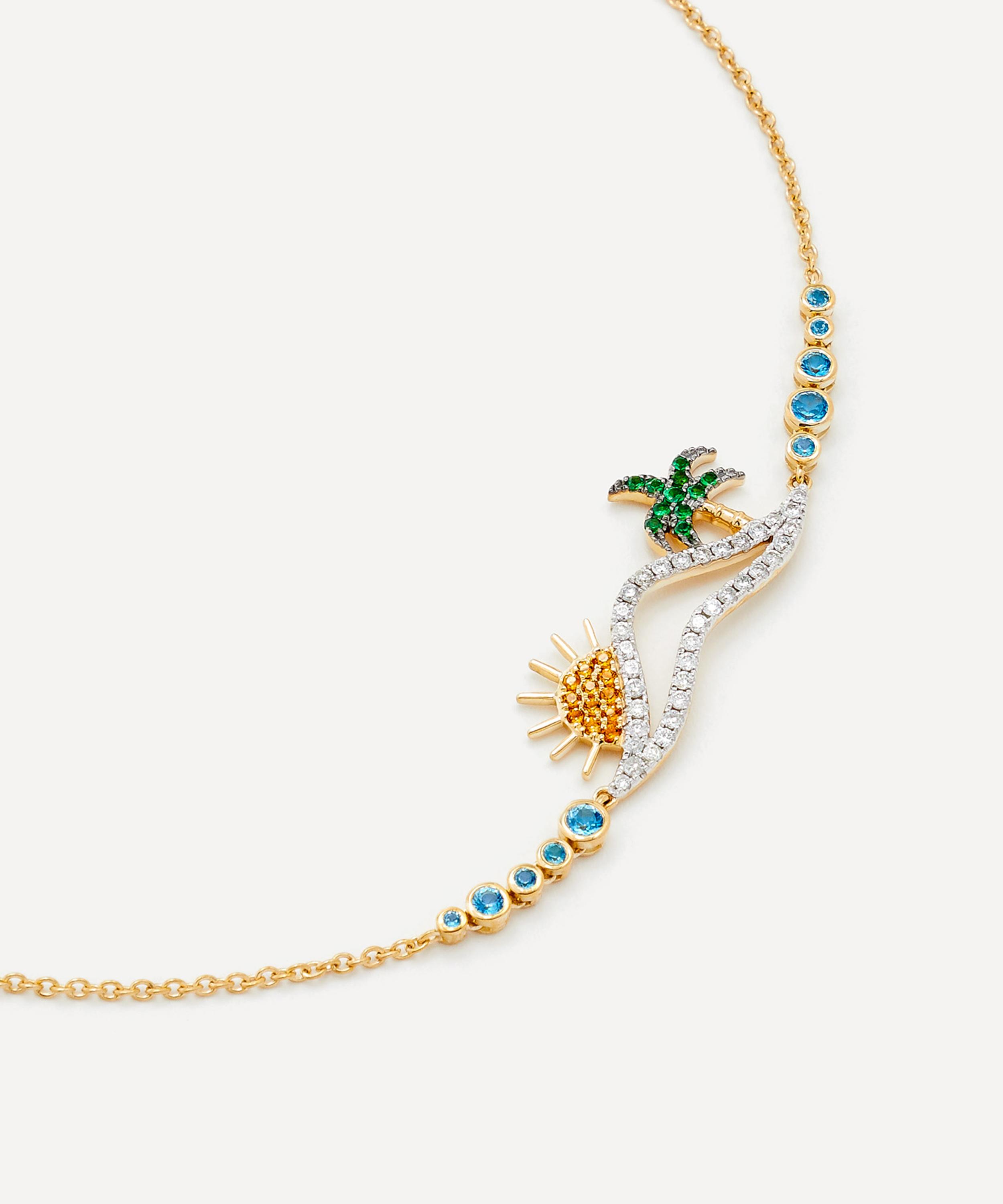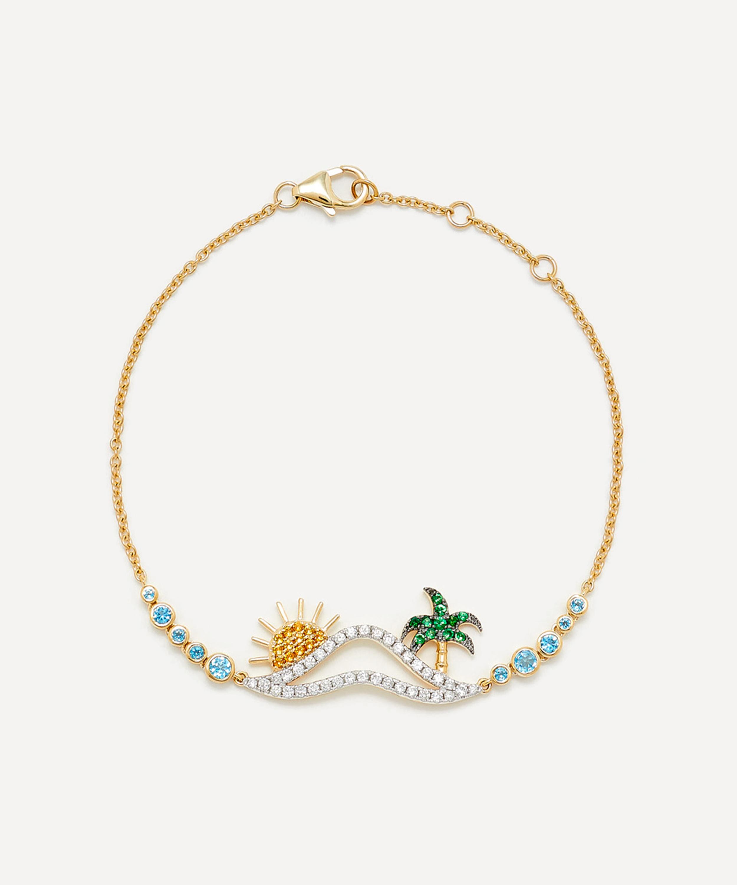 Delve into a world of vintage classics and tie your whole look together with this bracelet from Yvonne Léon. Crafted from 9ct gold, the designer beautifully unites vintage charm with a modern reinvention in this piece – featuring a fine trace chain and gemstone set beach design, with graduating, blue topaz accents. Wear it on its own, incorporate into a wrist stack, or mix and match with other pieces from the brand.
