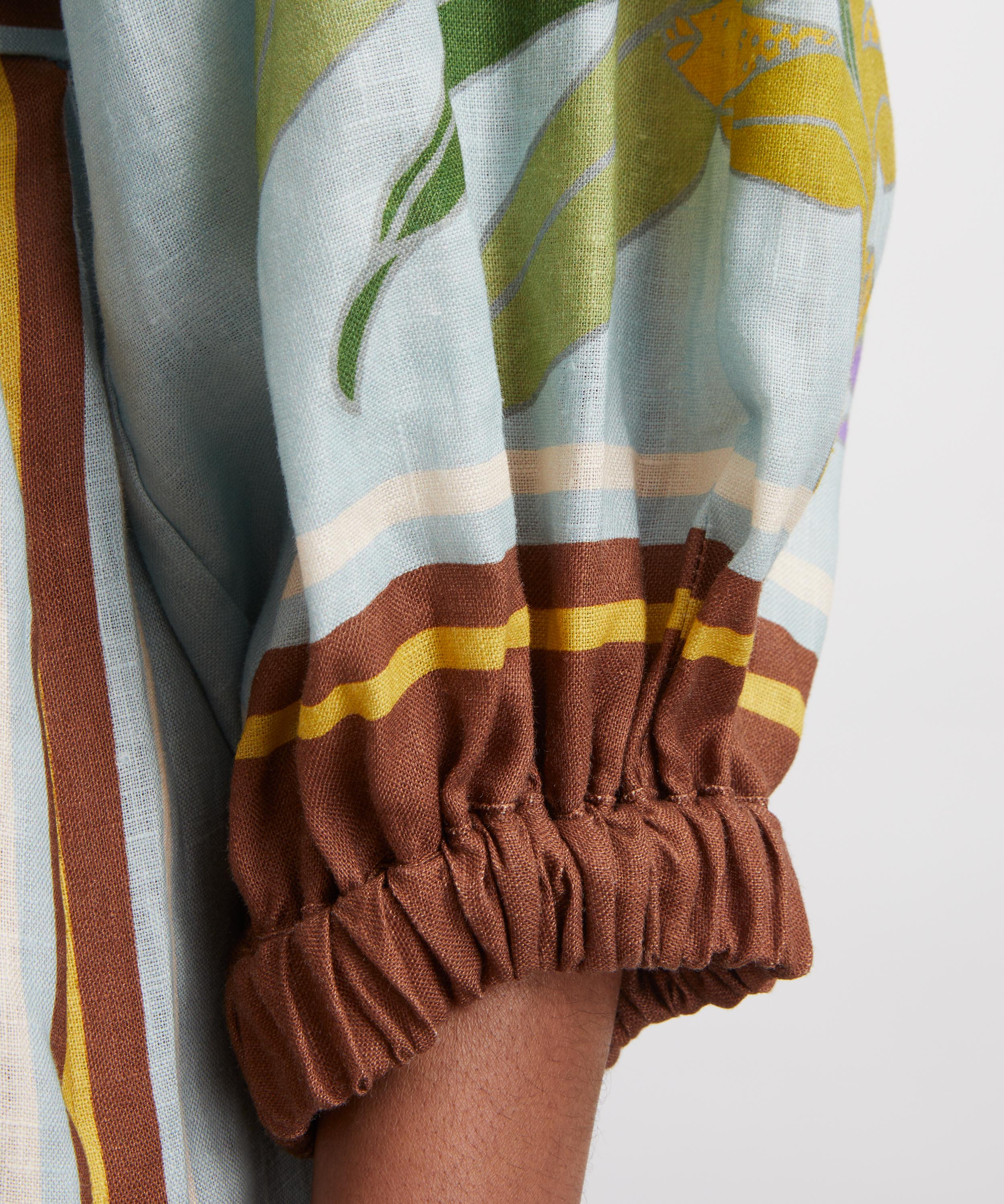 Adorned with a floral print motif, this linen dress exudes elegance through its relaxed, long-line silhouette, featuring a point collar, concealed closure, cuffed raglan sleeves, and self-tie belt at the waist.