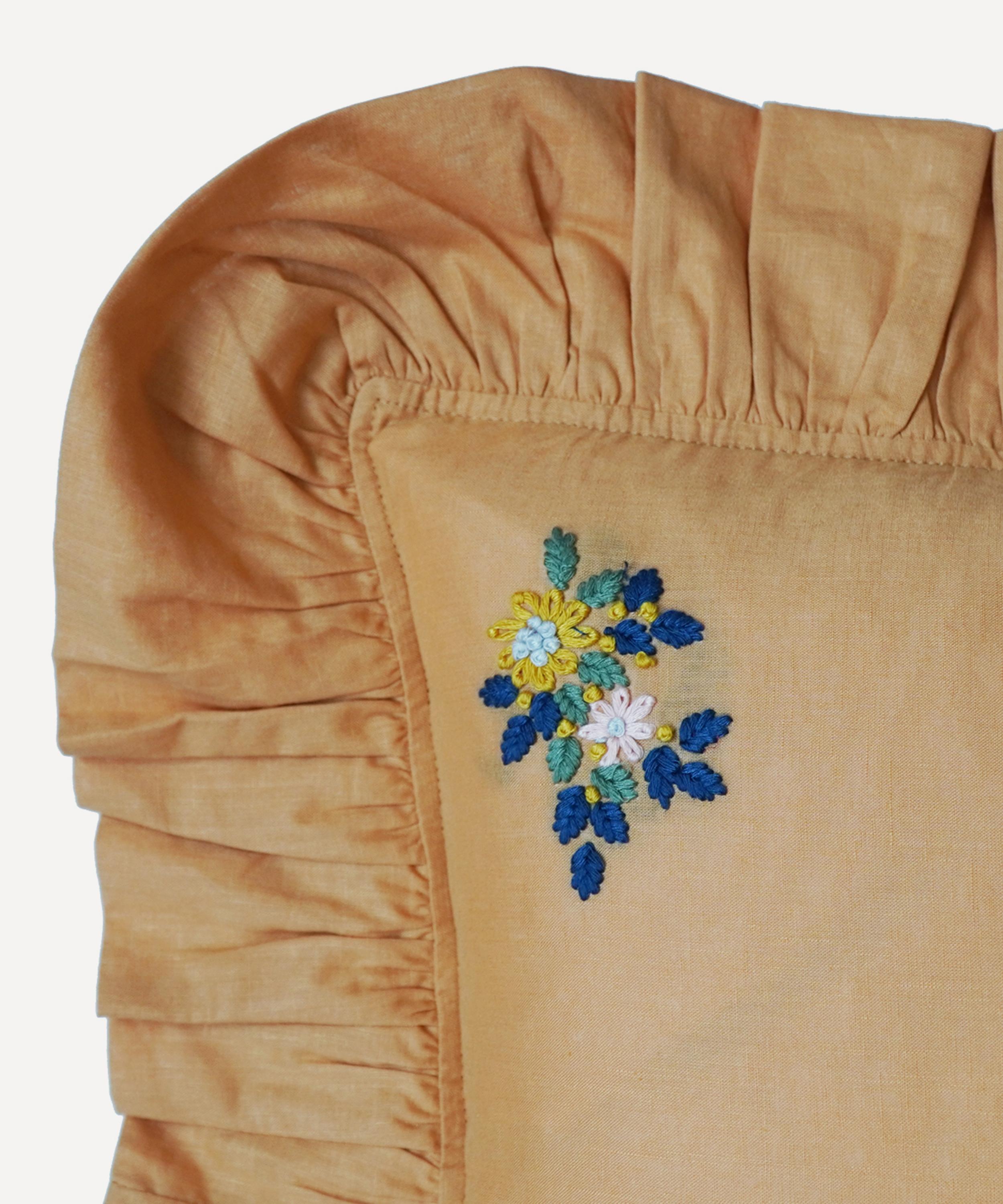 The cushion is expertly handmade in England from Liberty’s Augusta cotton-linen blend and features floral embroidery in each corner. Finished with generous ruffled edges and fitted with a duck-feather insert, it brings a note of artful indulgence to your daybed, sofa or armchair – especially when paired with the brand’s other cushions and soft furnishings.