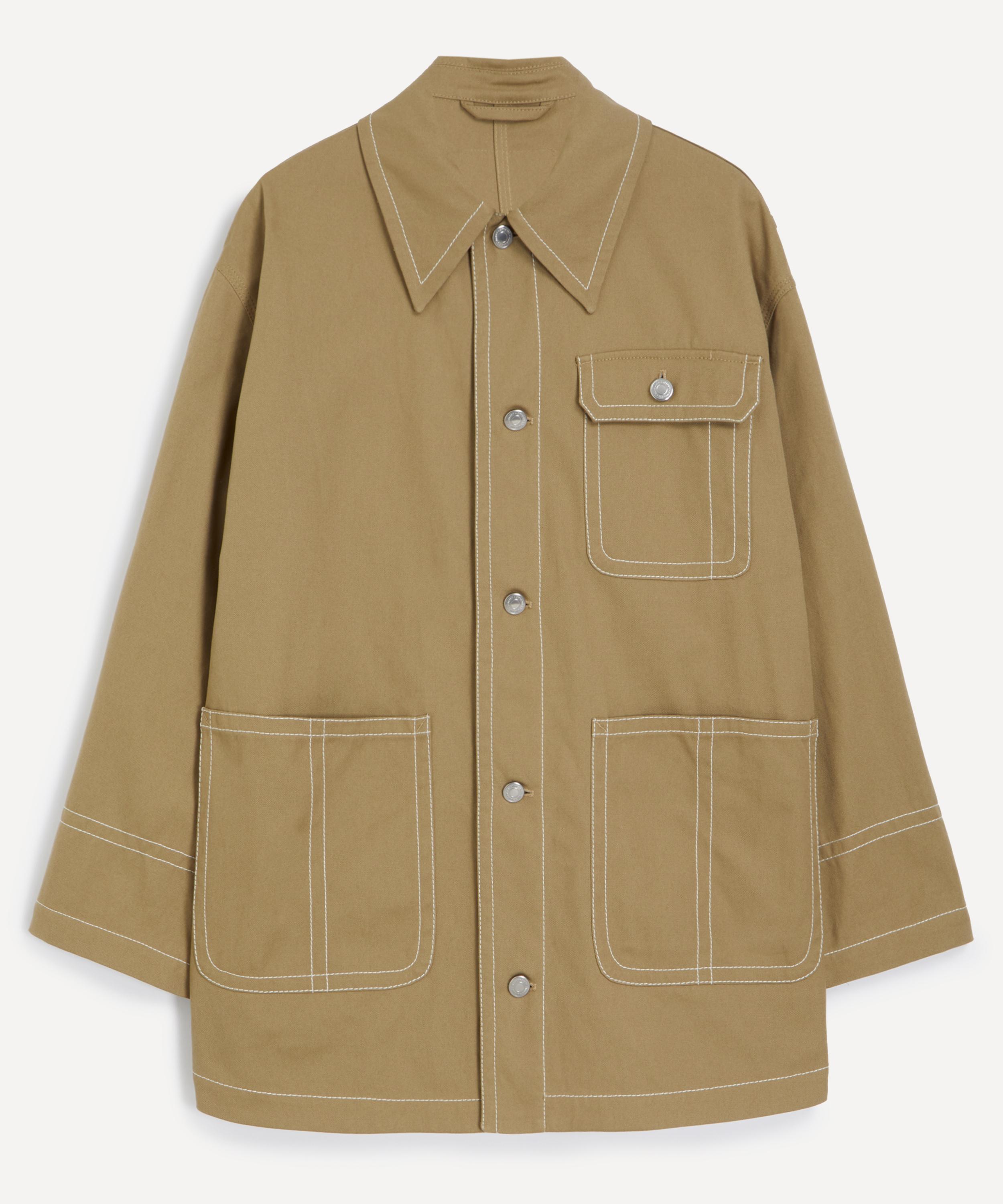 Cut from cotton gabardine, this jacket blends classic workwear style with refined detailing. It features a point collar, a button placket fastened with branded silver tack buttons, and multiple front pockets for a functional finish.