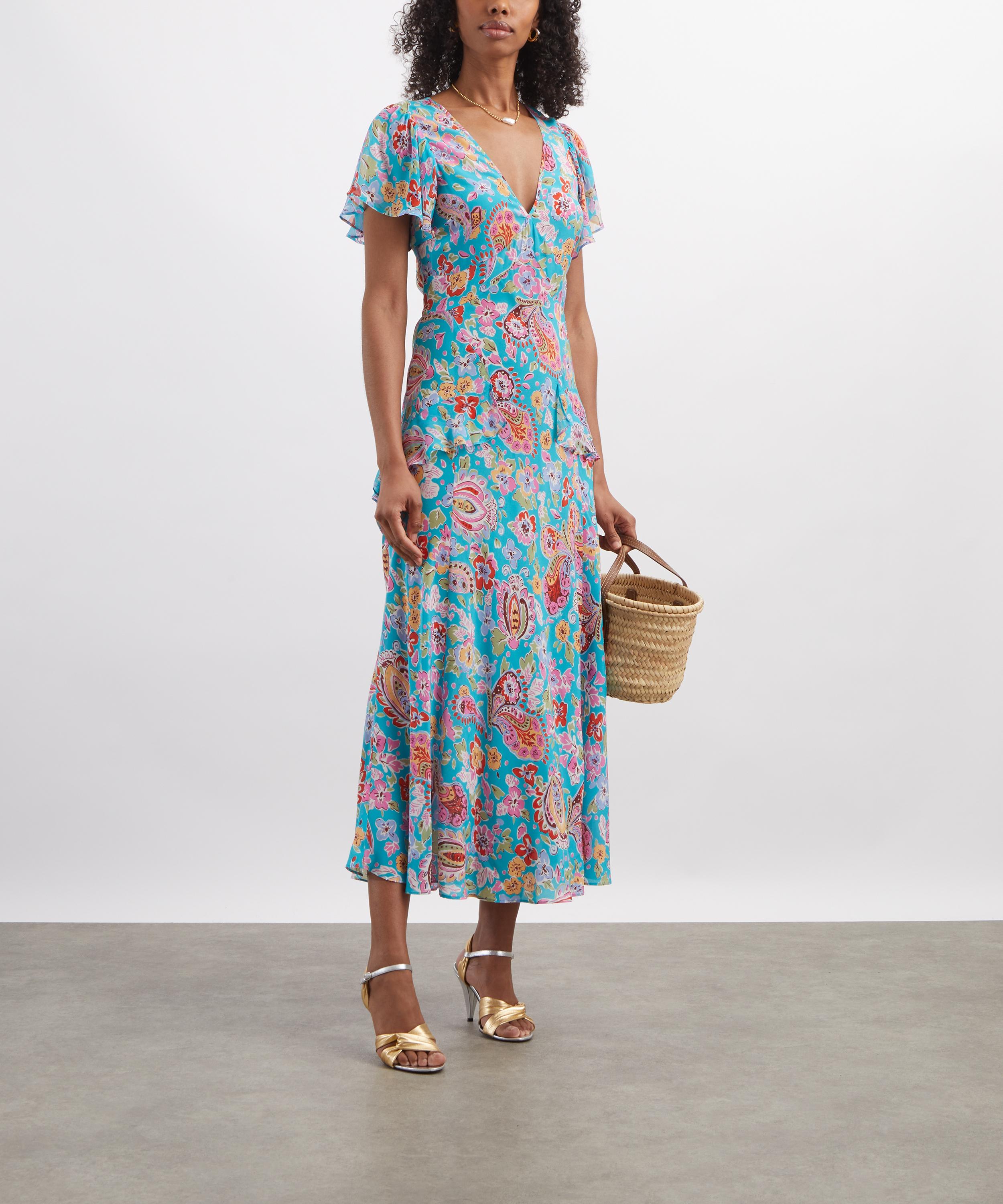 Crafted from a lightweight silk crêpe de chine, this romantic, vintage-inspired dress features a turquoise floral print for contemporary occasion appeal. A classic V-neckline, short sleeves, and fluttery georgette ruffles at the hip frame the silhouette, while the empire waist flows into a graceful midi-length skirt.