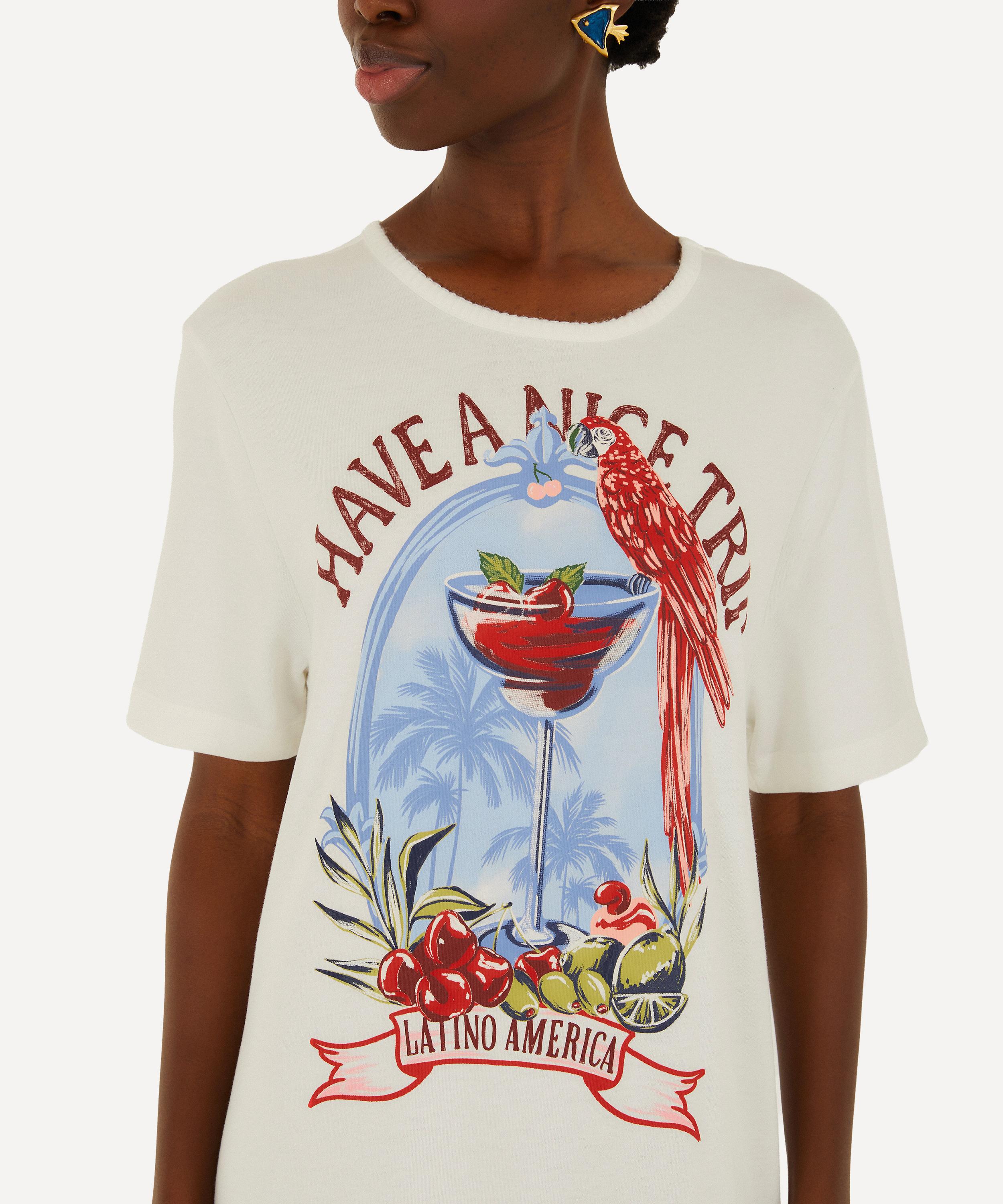 Embrace effortless charm with the Have A Nice Trip Maxi Dress by FARM Rio. Crafted from cotton, this T-shirt-style dress features a classic crew neckline, short sleeves, and a dropped waist that falls into a tiered, ankle-grazing skirt. A cheerful cocktail motif and the “Have A Nice Trip” slogan across the front lend a playful, summer-ready feel.