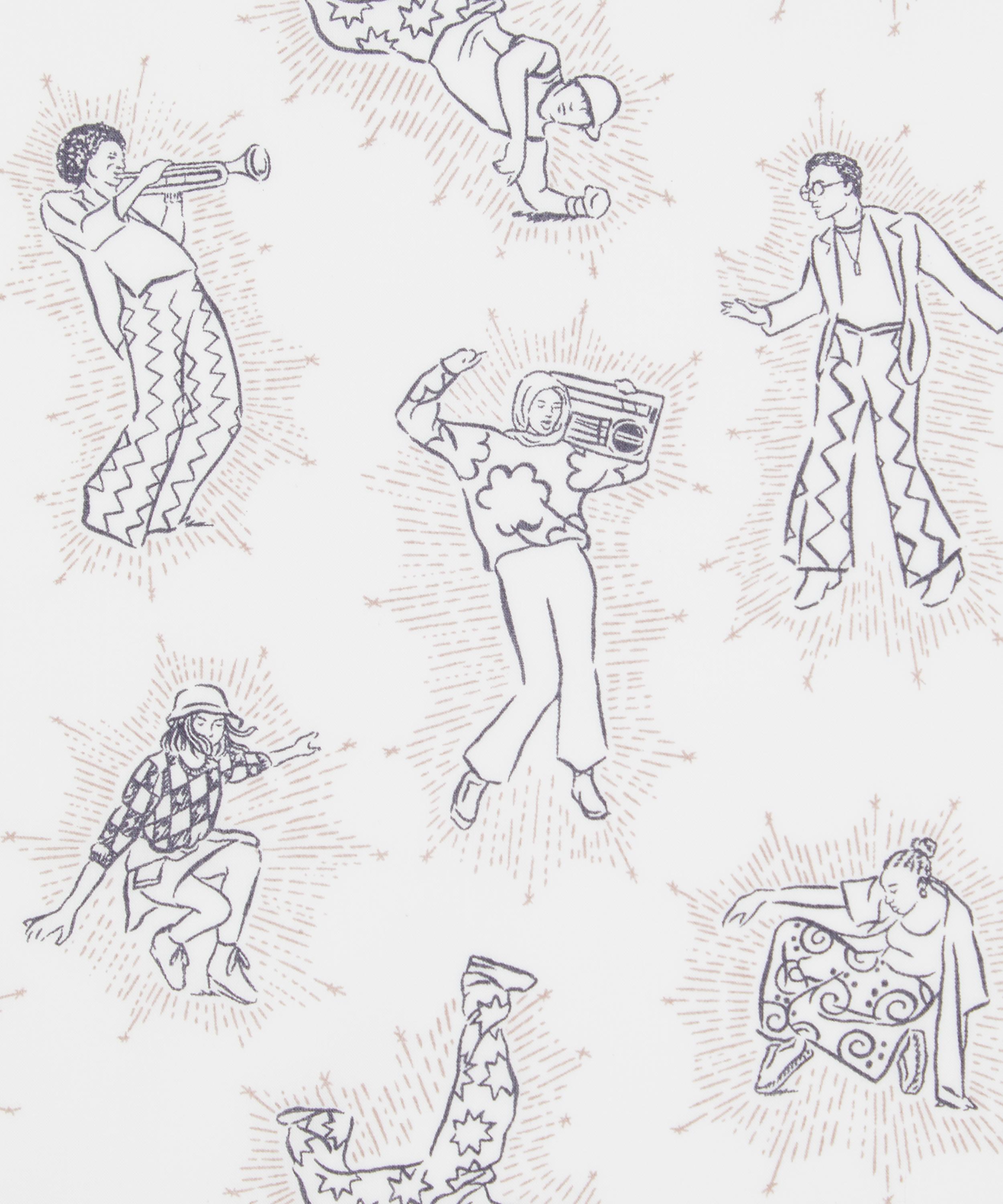 Hip Hop Jazz is a dynamic and expressive print that draws inspiration from the deep-rooted connection between fashion and music, particularly through the vibrant subcultures of hip-hop and jazz. Hand-drawn in the Liberty design studio, this quirky conversational print captures imagined dancers moving fluidly to the beat of the music.