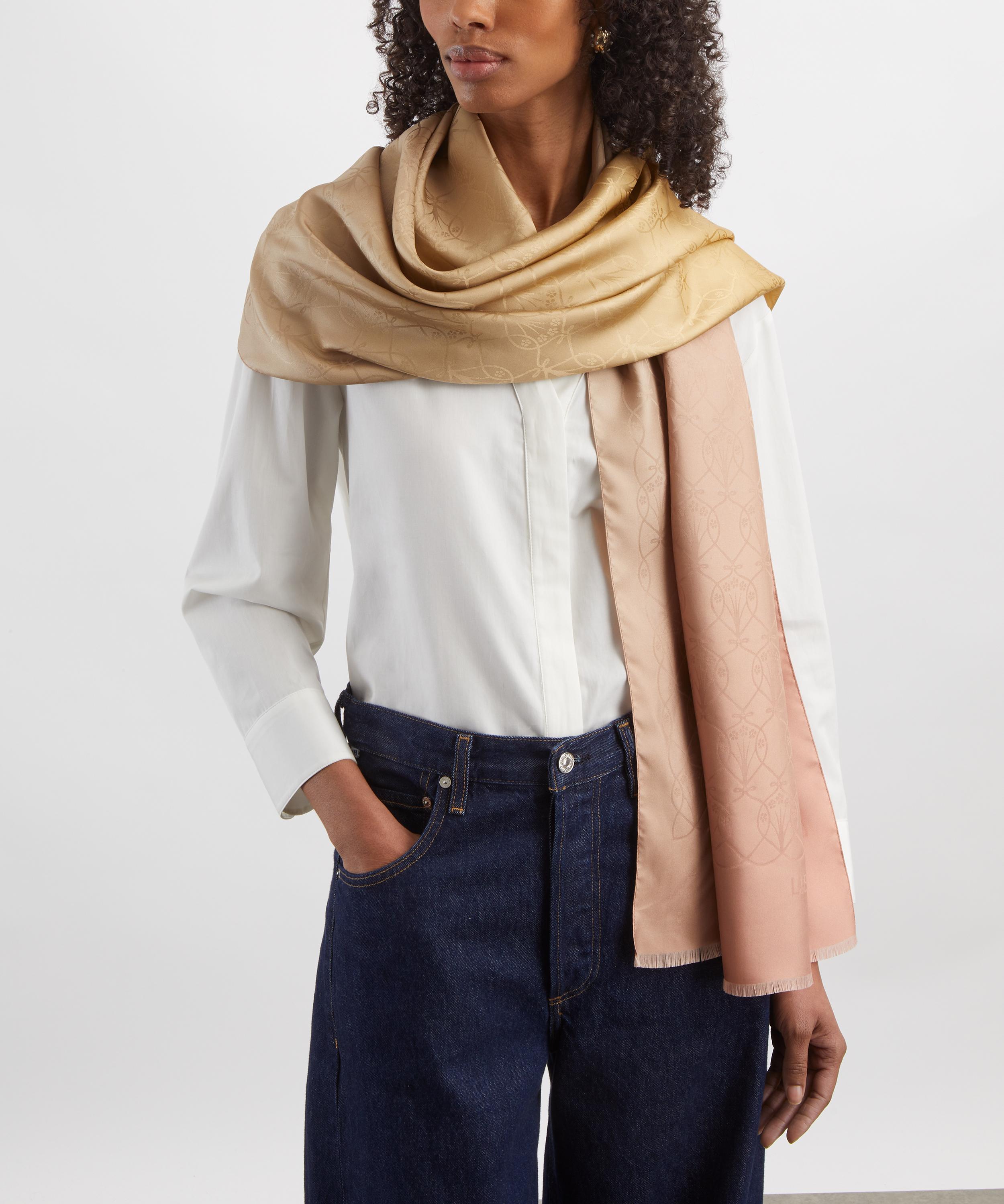 Expertly woven from ultra-soft silk twill, it showcases a reworked rendition of our iconic Art Nouveau print, Iphis – the motif is woven into a textured jacquard surface, producing gentle depth and sheen. The design sits over an ombré gradient that shifts from golden yellow to terracotta for a warm tonal progression. Bursting with colour and vitality, this versatile and timeless accessory staple will bring a refreshing lift to your wardrobe. Try draping it over neutral outerwear for a bold style statement, experiment with monochromatic looks, or knot it close to the neck to lock in warmth.