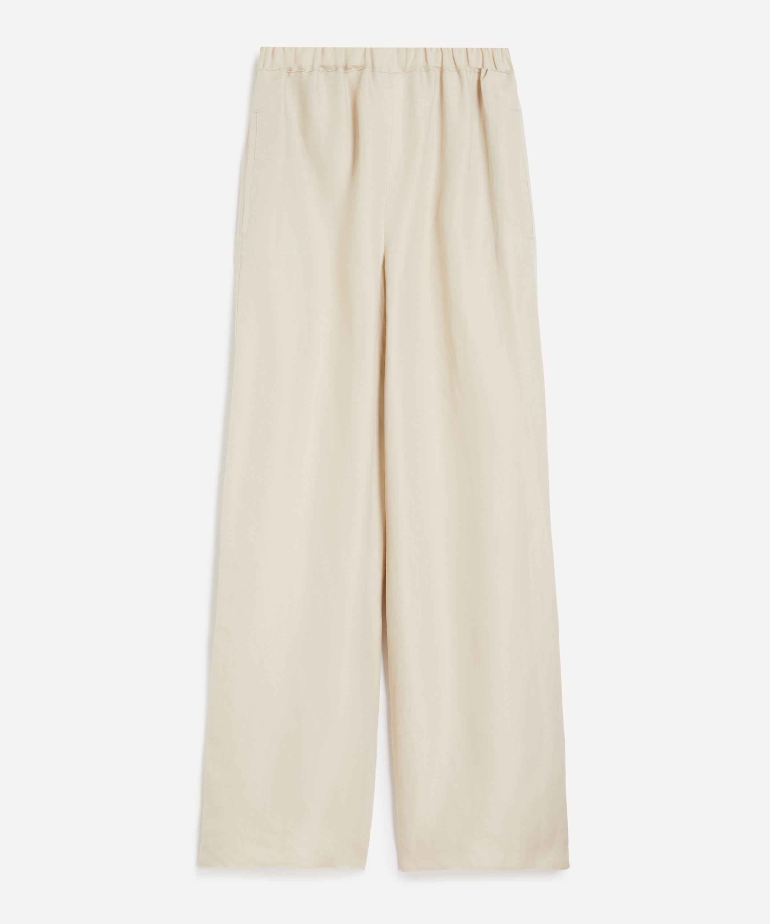 Crafted from a breathable linen-silk blend, these wide-leg trousers feature a loose silhouette with an elasticated waistband and subtle front pleat detailing.