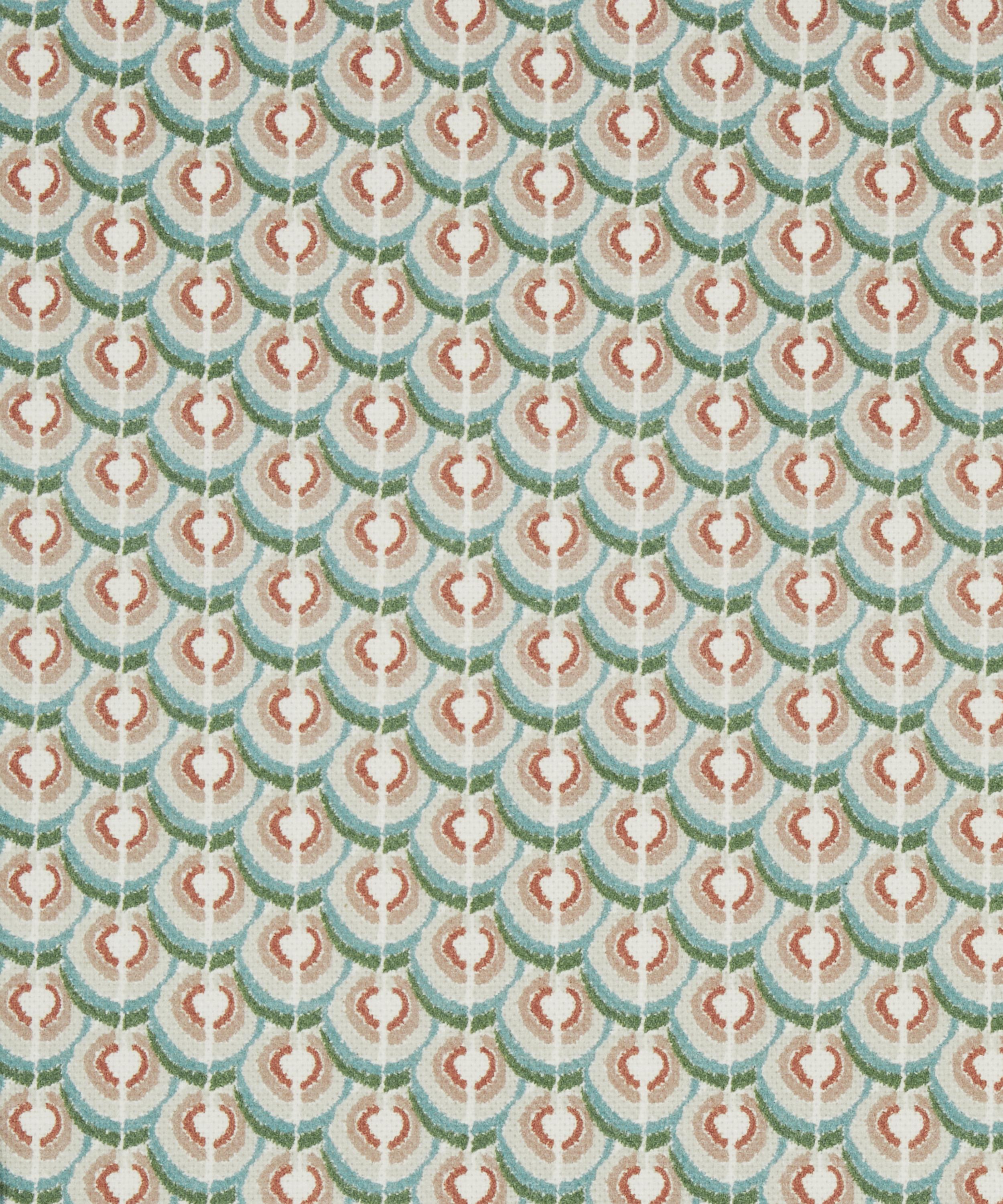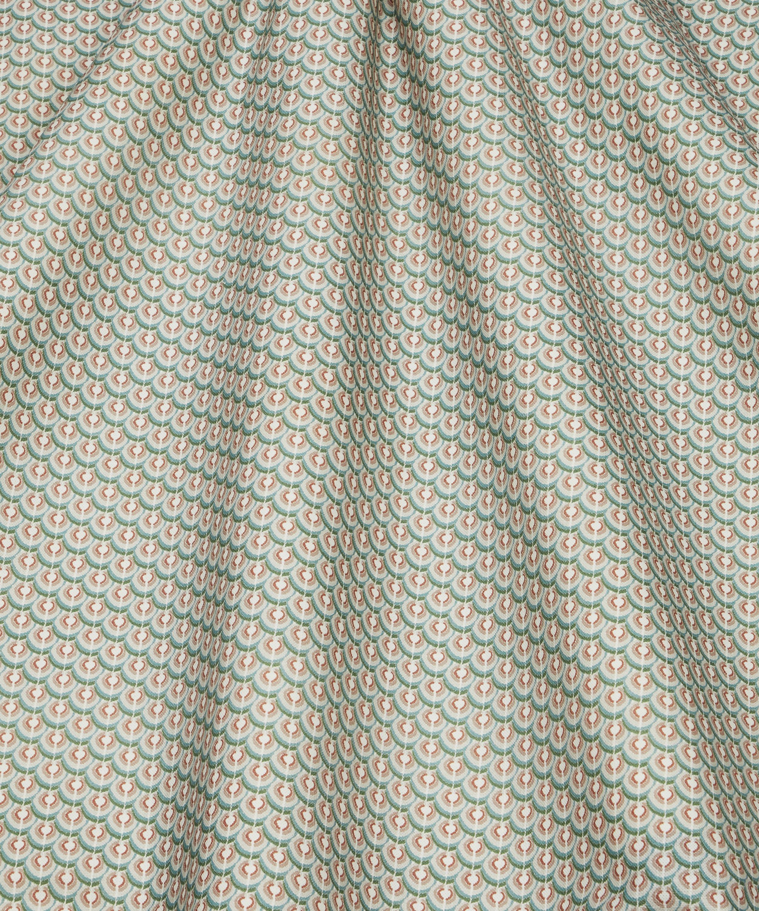 Inspired by the iconic markings of regal peacock feathers, this all-over geometric design was originally drawn with the decisive mark-making of oil pastels, providing a hand-drawn aesthetic to an otherwise graphic print.