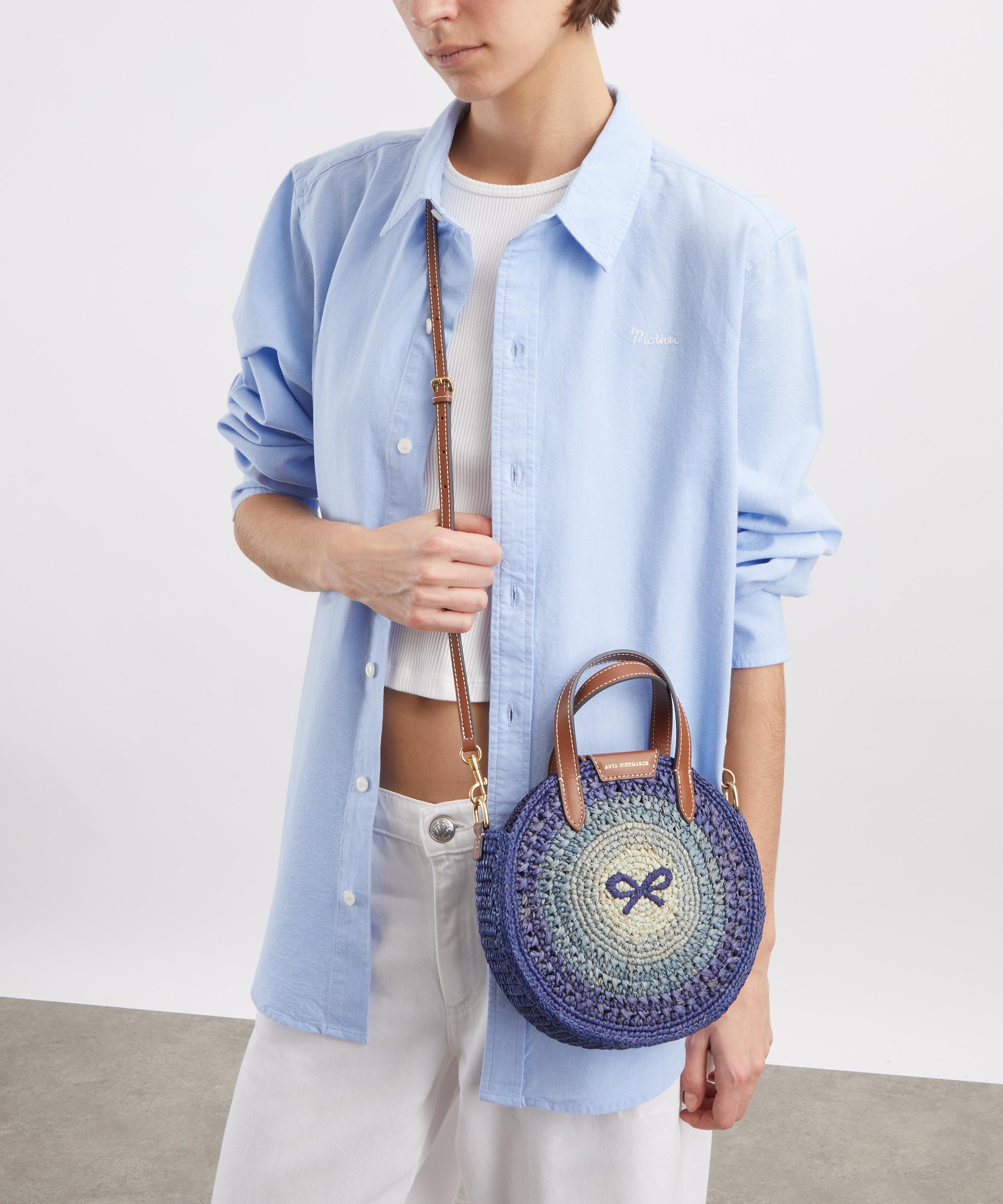 This small raffia round tote bag from Anya Hindmarch boasts a versatile design that highlights the brand’s flair for enduring playfulness and artisanal craftsmanship.