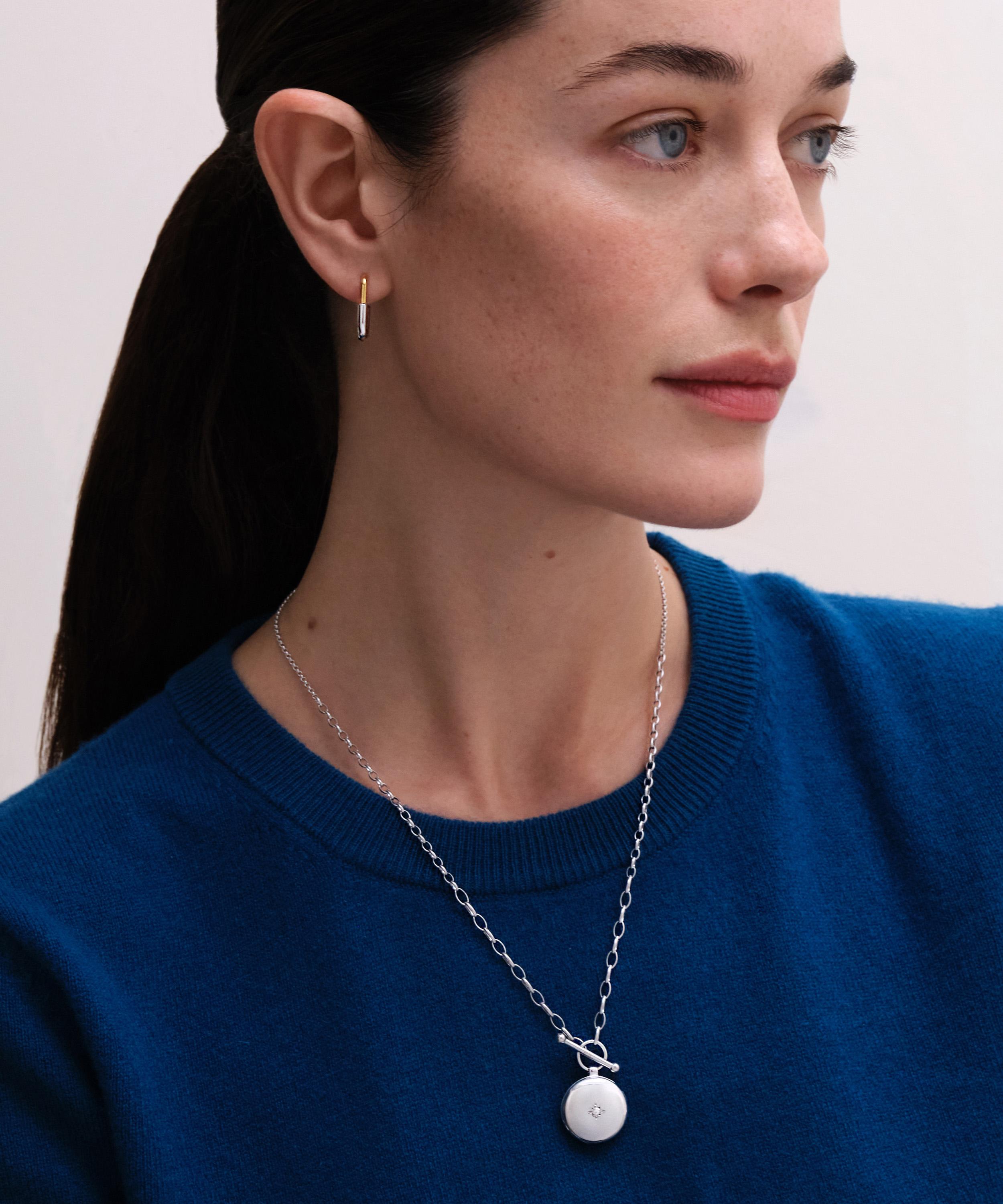 Crafted from sterling silver, it features a classic cable chain and a round locket, with space for two photos, embellished with a star-set white sapphire. Complete with a T-bar and toggle closure, it can be styled as a solo piece or incorporated into a curated stack.