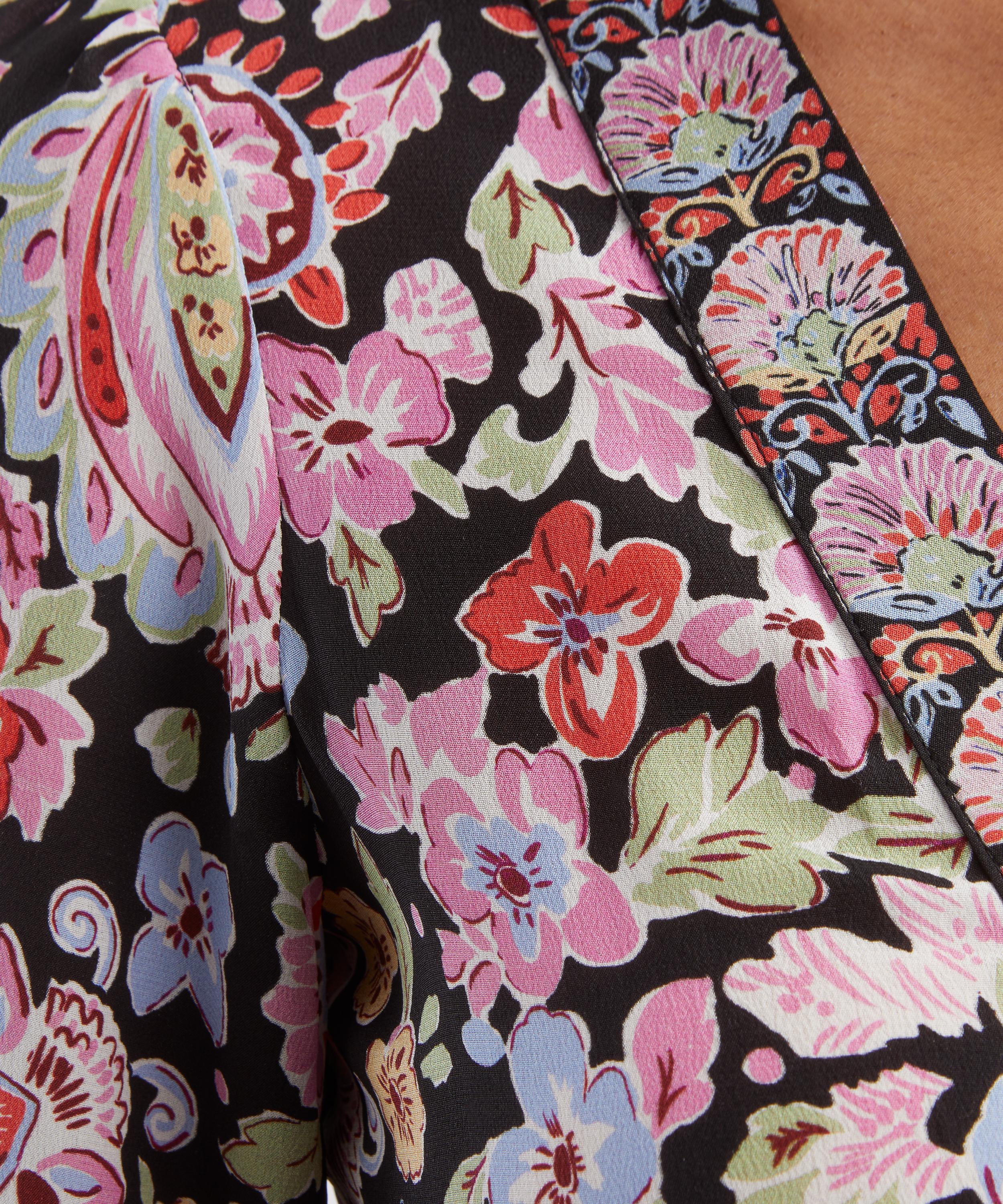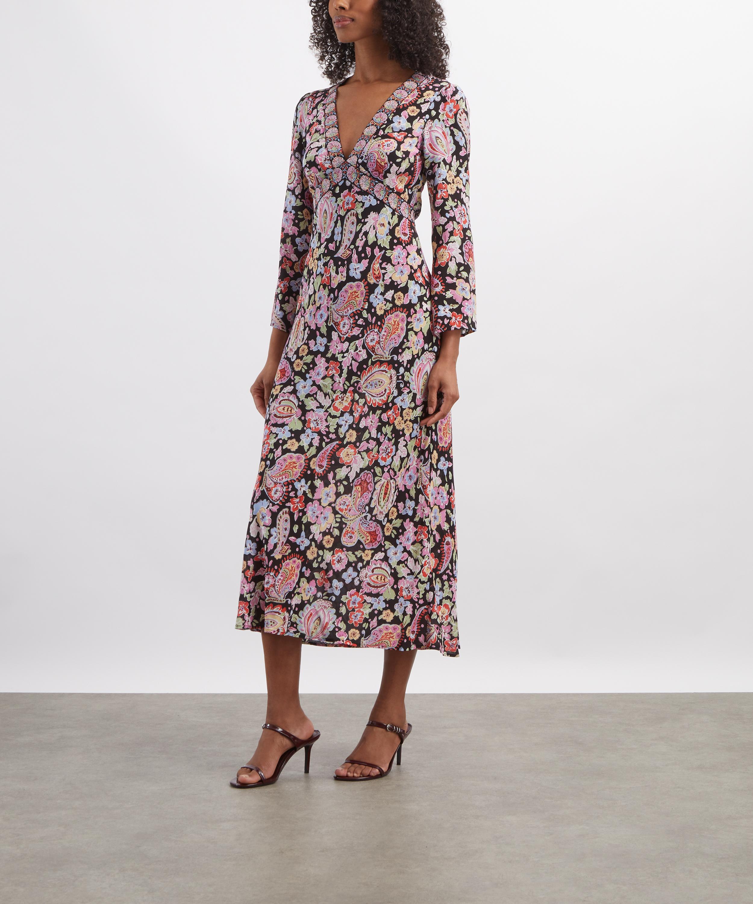 Crafted from a lightweight silk crêpe de chine, this romantic, vintage-inspired dress features a vibrant floral print for timeless occasion appeal. A deep V-neckline and long sleeves frame the silhouette, while the empire waist flows into a graceful midi-length skirt.