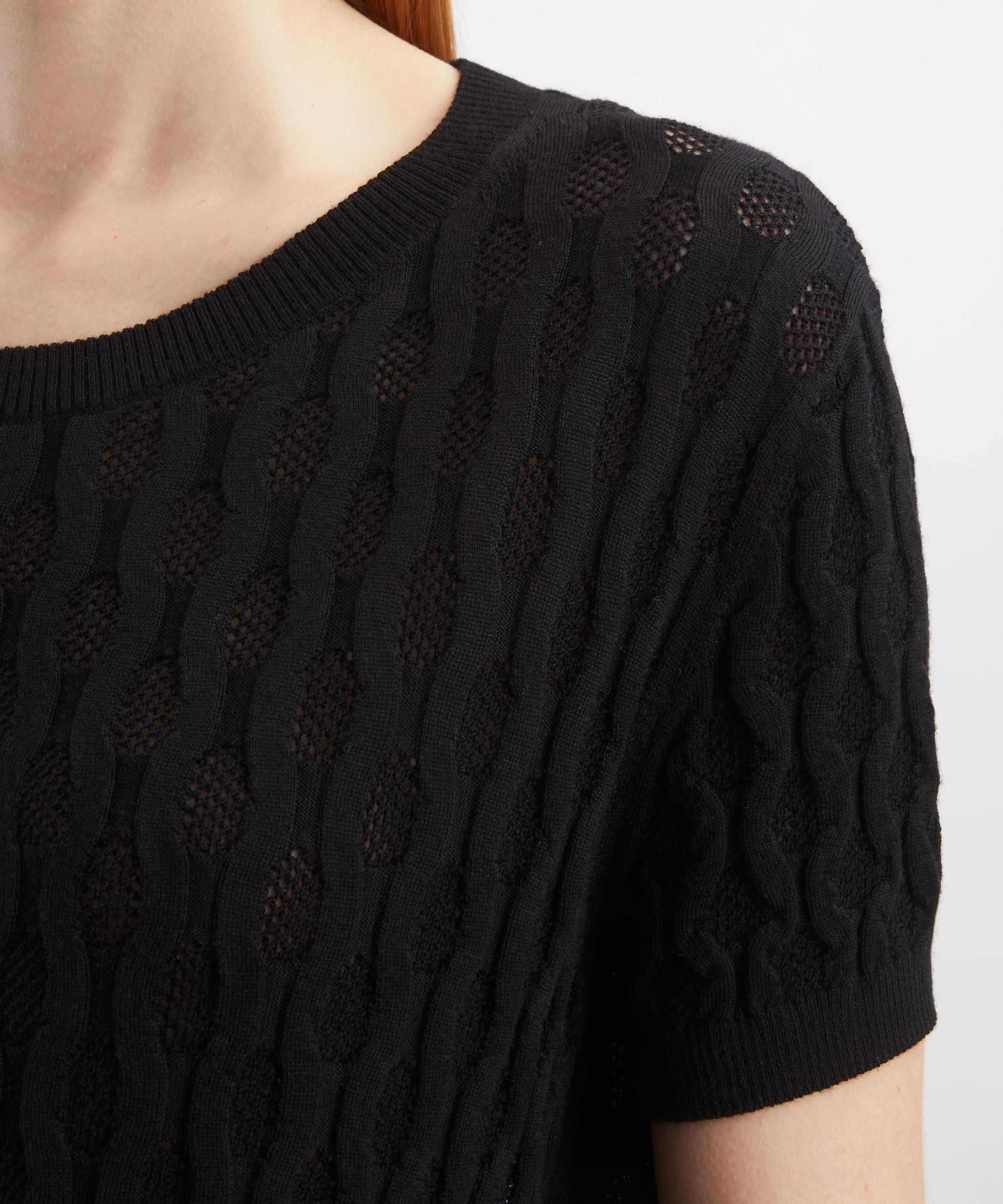 Cut from fine merino wool, this luxuriously-soft sweater features a crew neckline, short sleeves, a banded trim and lace stitch detailing.
