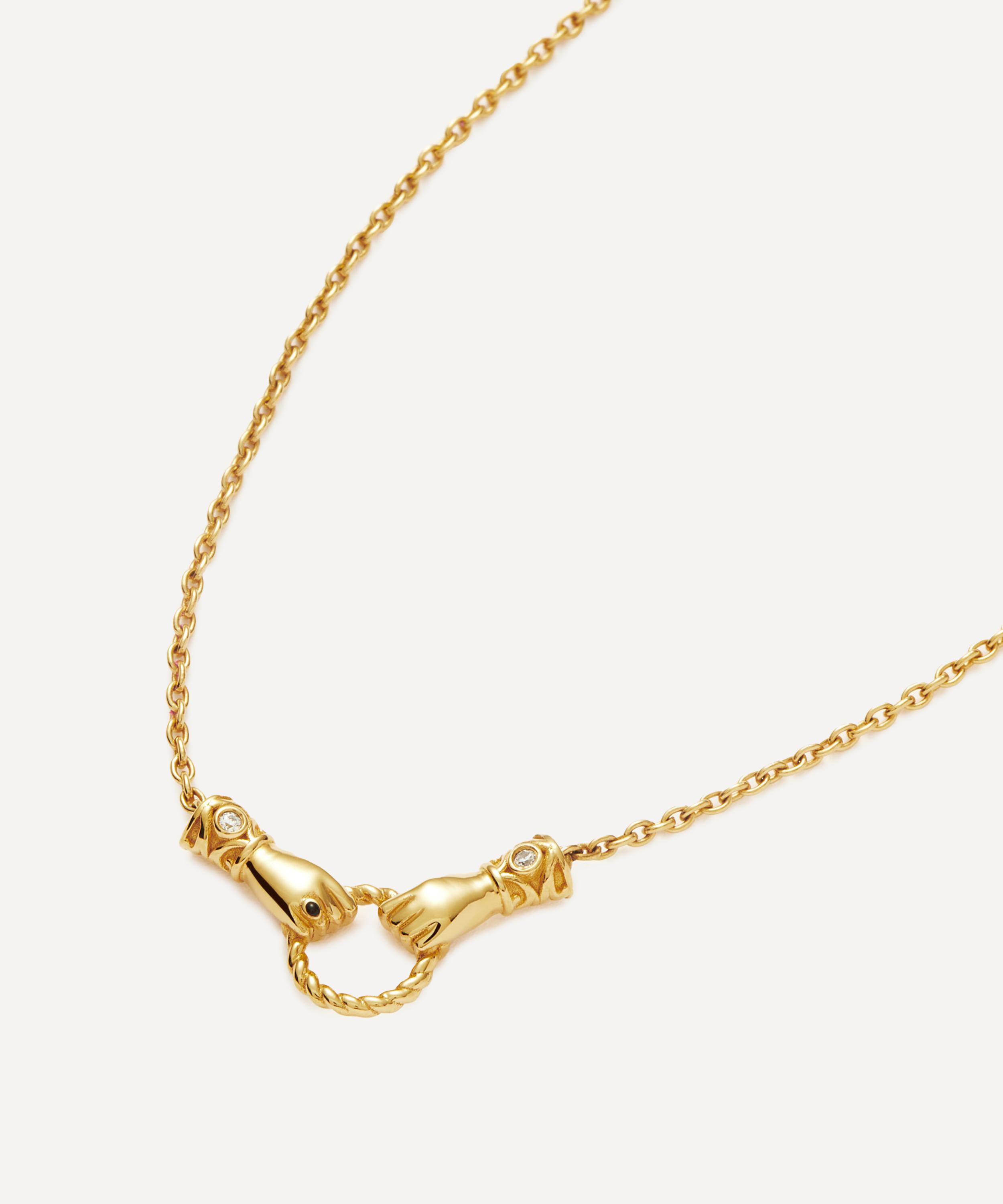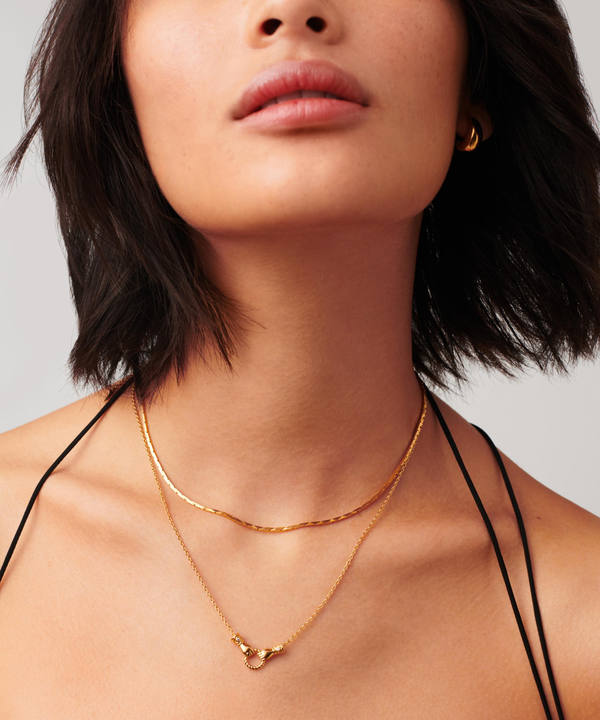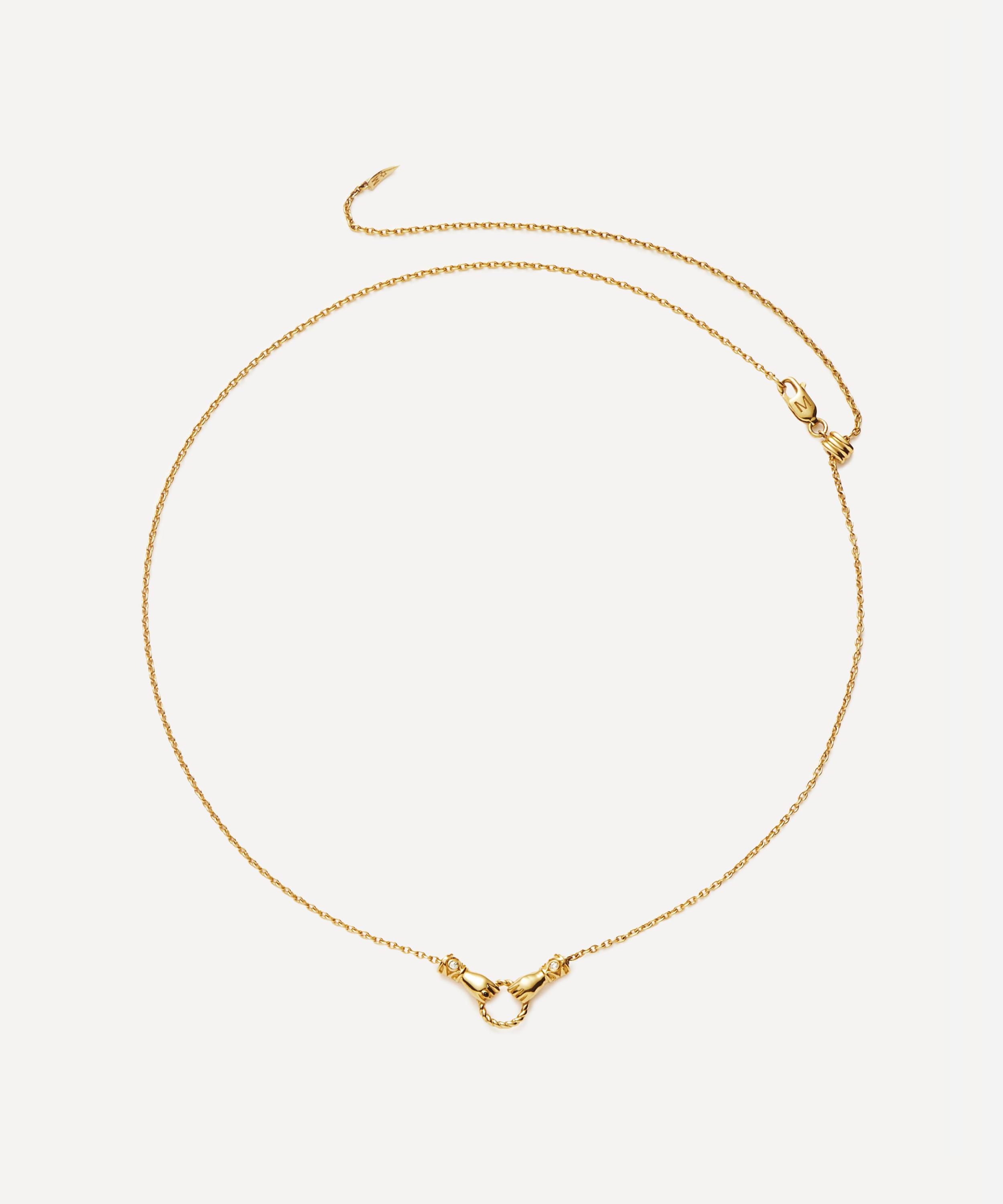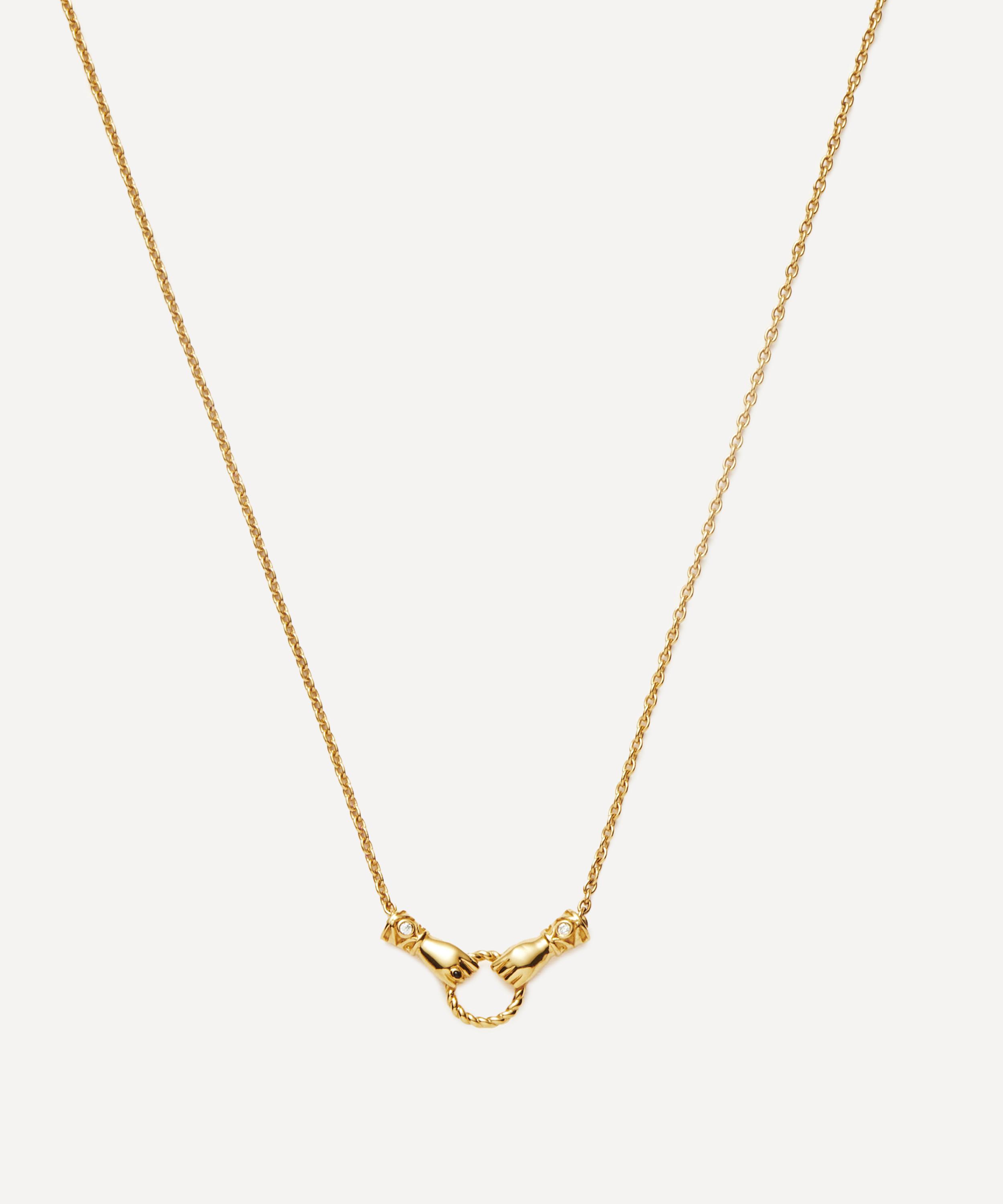Curate your own bespoke stack with this pendant necklace from the Harris Reed x Missoma collection. Crafted from gold-plated brass, it features a fine cable chain and two Georgian-style hands, inspired by the collections popular ‘In Good Hands’ design, holding a twisted ring. Each cuff has been embellished with a white cubic zirconia and one hand features a black enamel ring. Wear it solo, or team with an assortment of necklaces or matching pieces from the collection.