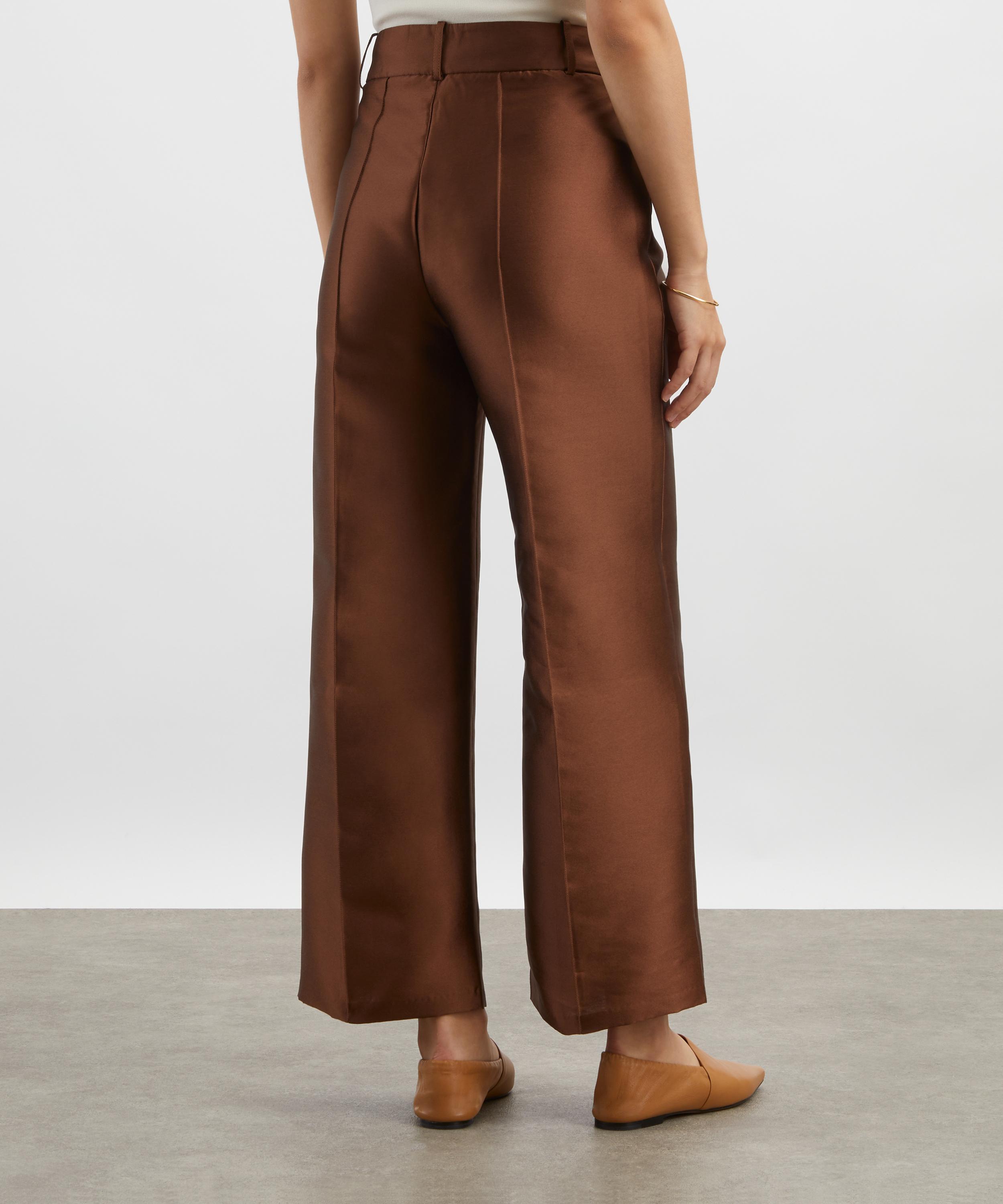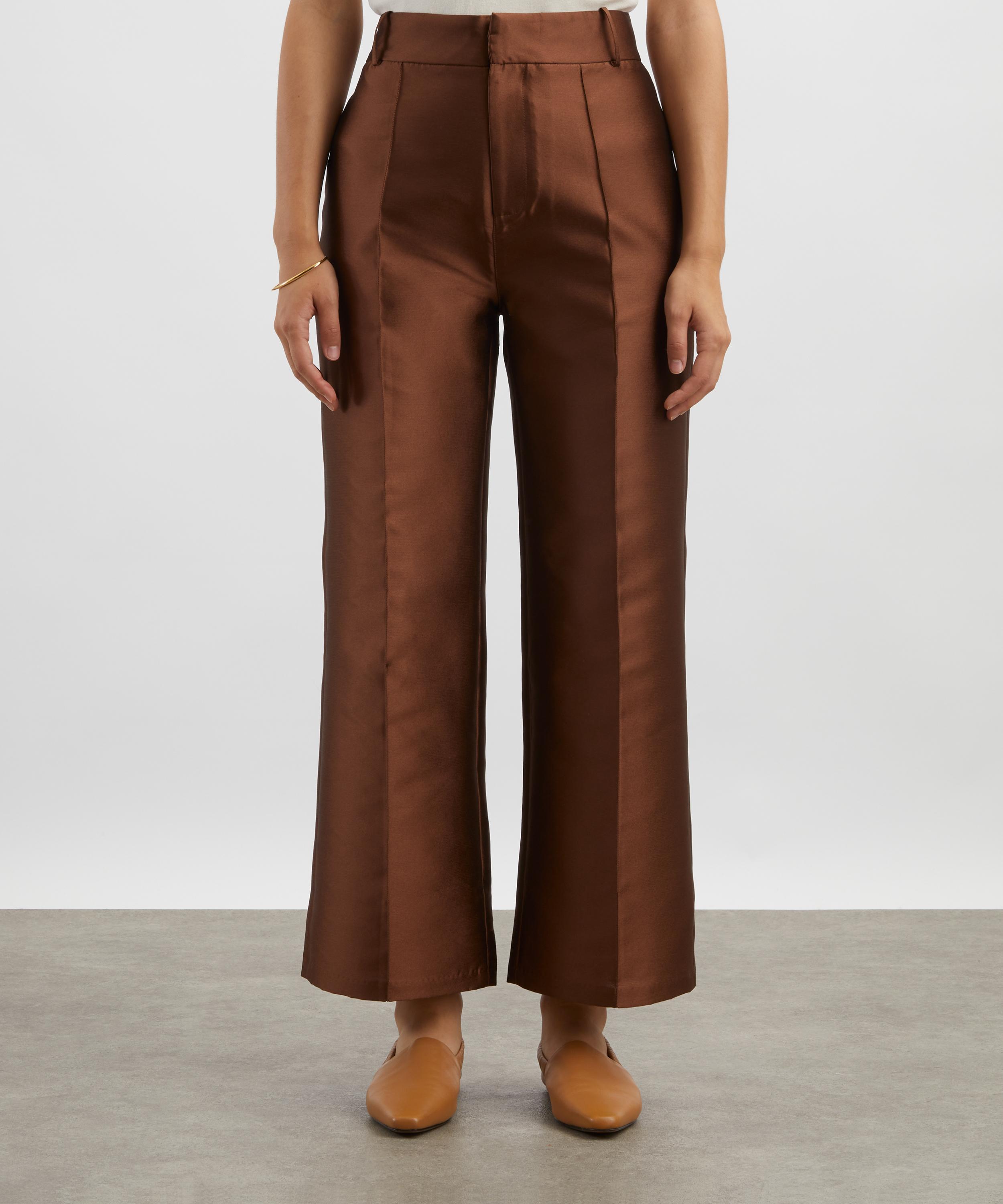 A signature silhouette reimagined in a rich cappuccino-brown hue, DESTREE’s Yoshimoto trousers are crafted from a sumptuous silk blend. Designed to sit high on the waist, they feature a straight, subtly flared leg with a pressed front crease that falls to a chic cropped length.