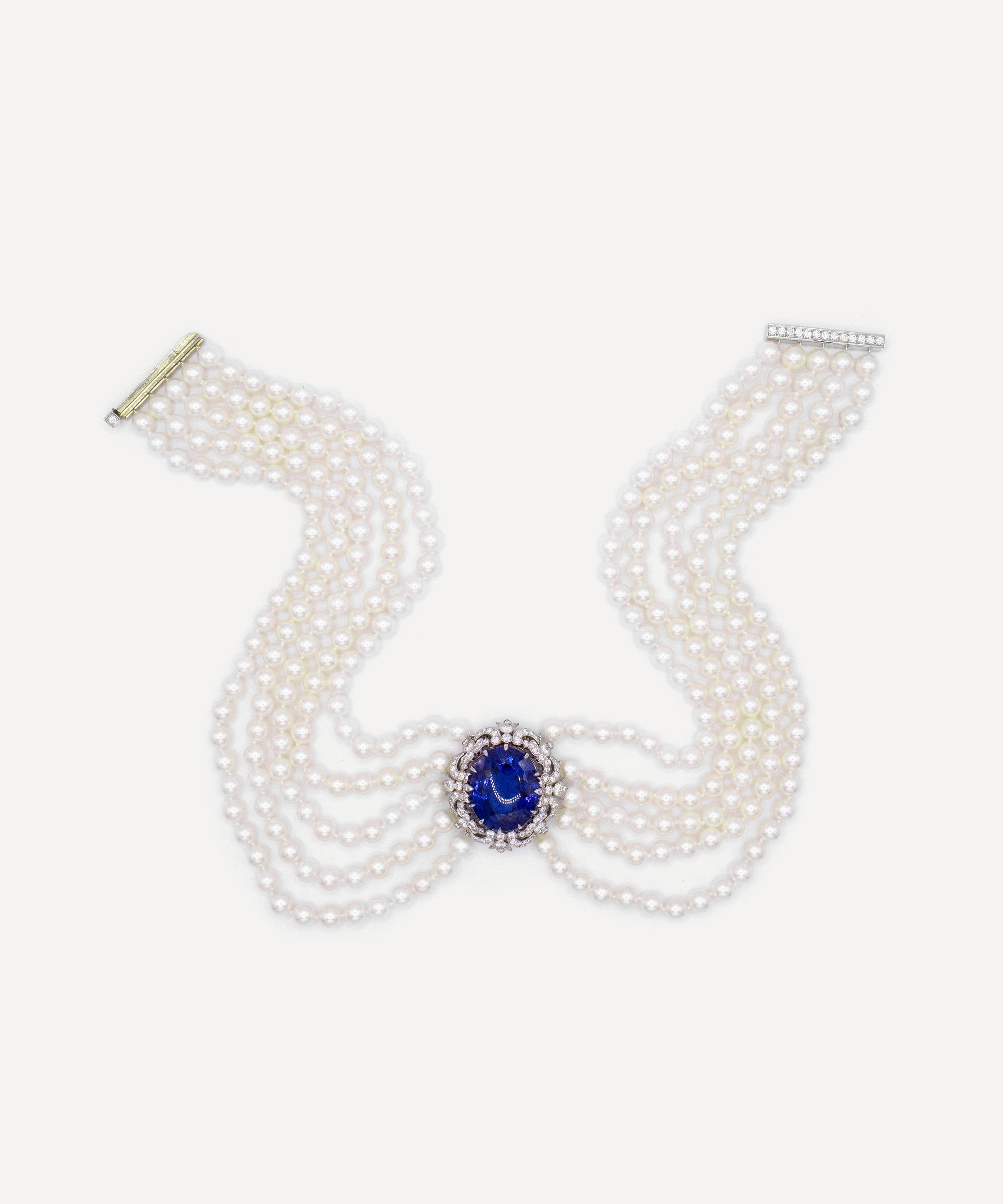 Showcasing the coveted craftmanship and artistry of a bygone era, it features four strands of round white cultured pearls, with a detachable brooch at the centre, allowing the piece to be worn either as a necklace or as a standalone jewel. The brooch is set with a striking oval cut tanzanite, surrounded by a halo of round diamonds, creating a bold focal point with rich colour contrast. A standout piece for any vintage collector or unique jewellery-lover, this convertible jewel offers timeless elegance and multiple wearing options.