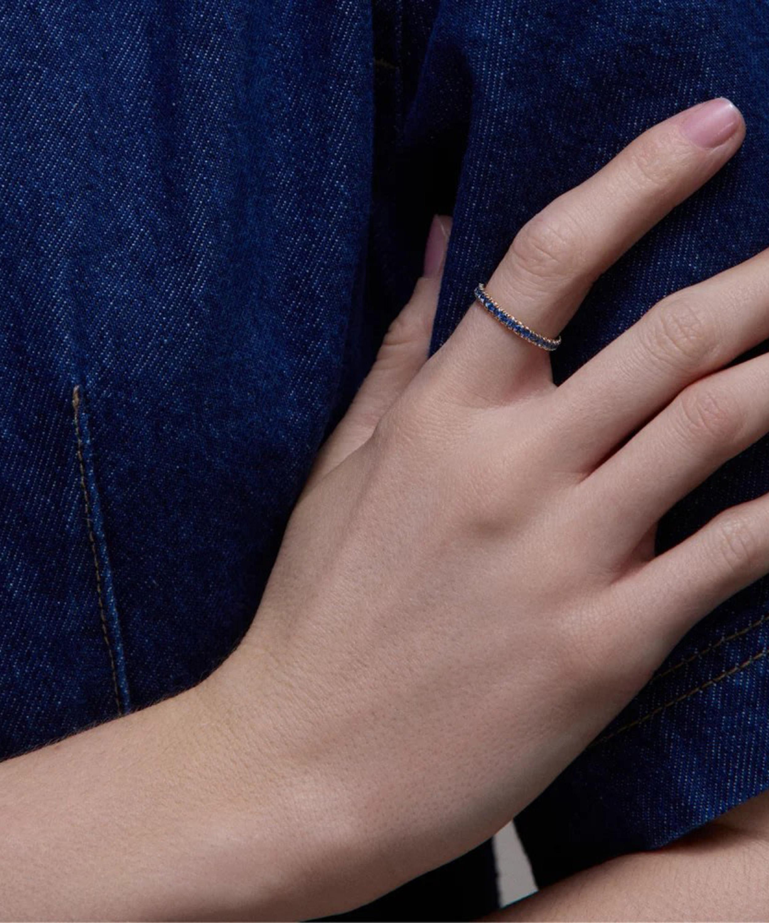 Signifying a lasting bond, it features a polished band rendered in solid 9ct gold, embellished with a continuous line of fishtail-set blue sapphires. Boasting a contemporary take on timeless jewellery, it can be worn solo for subtle sophistication or stacked with an engagement ring or wedding band.