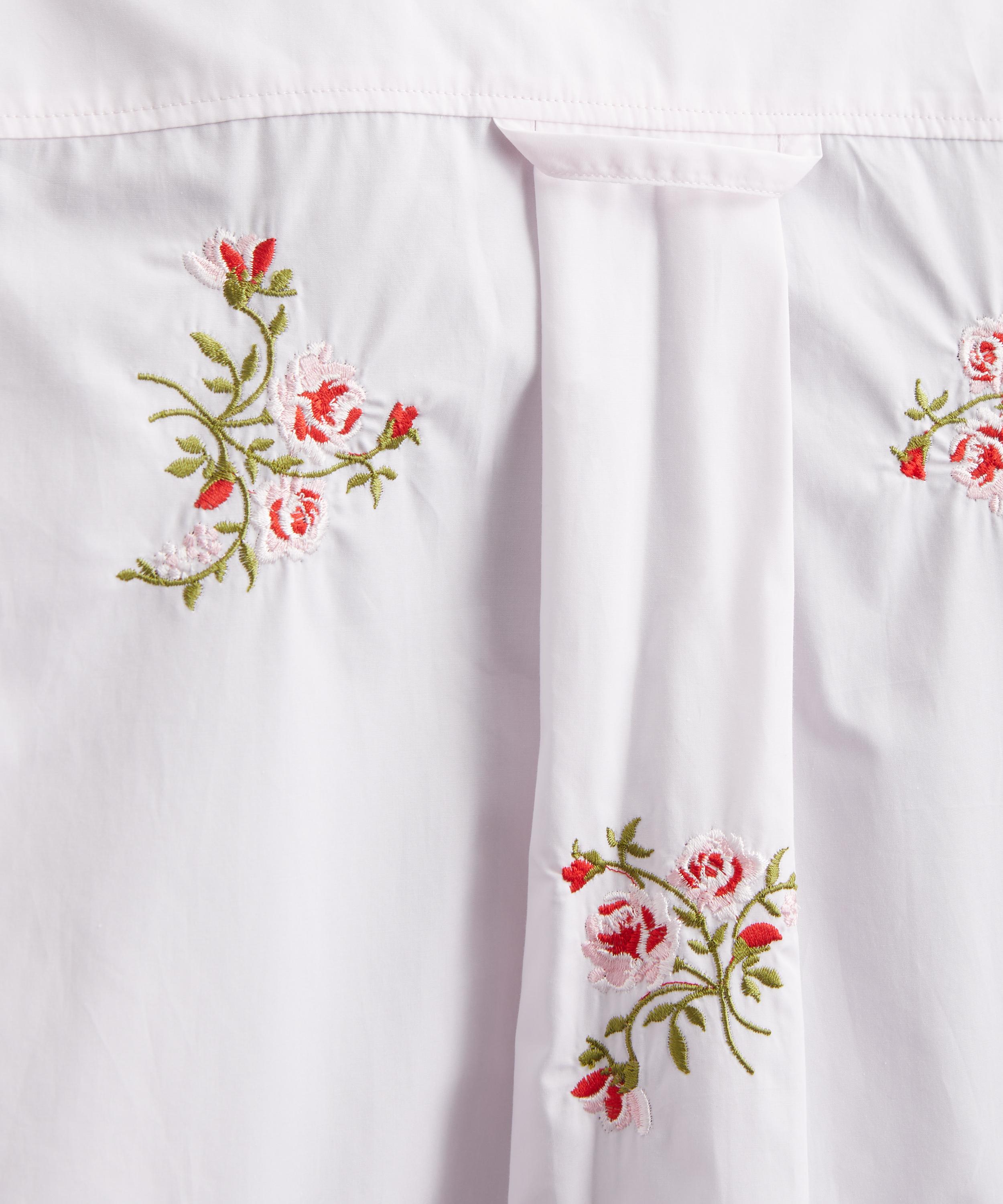 Crafted from light-pink cotton poplin, this short-sleeve shirt is cut for a boxy fit with dropped shoulders, elbow-length sleeves, a concealed button placket, and a single pen pocket to the chest. Intricate rose embroidery completes the design, adding a subtle romantic note to a casual classic.